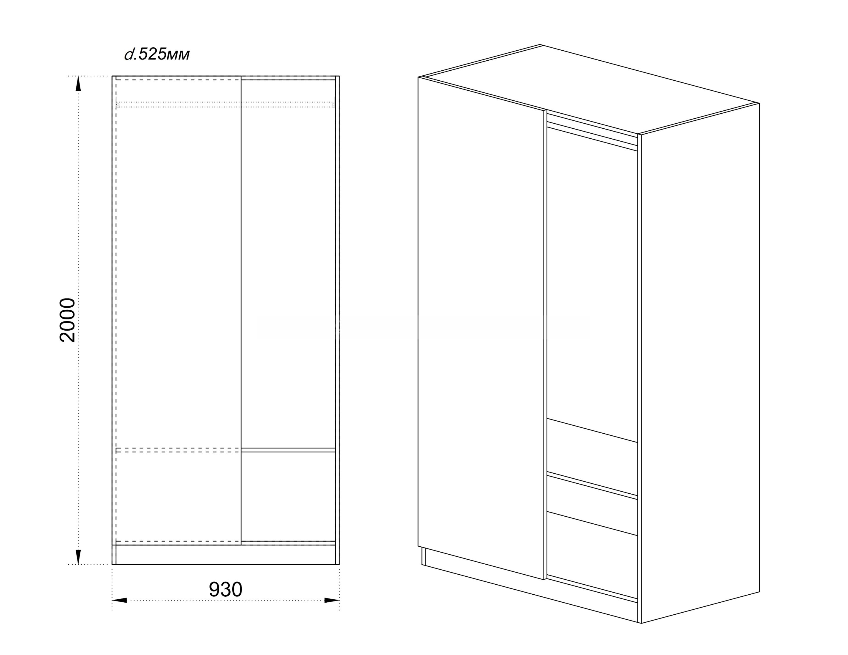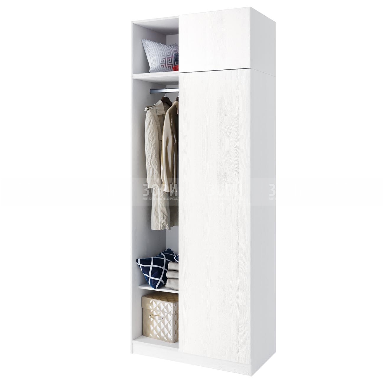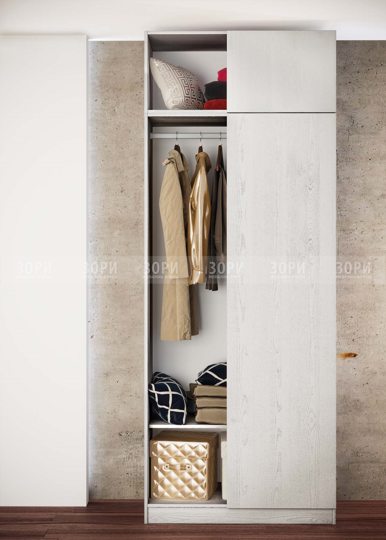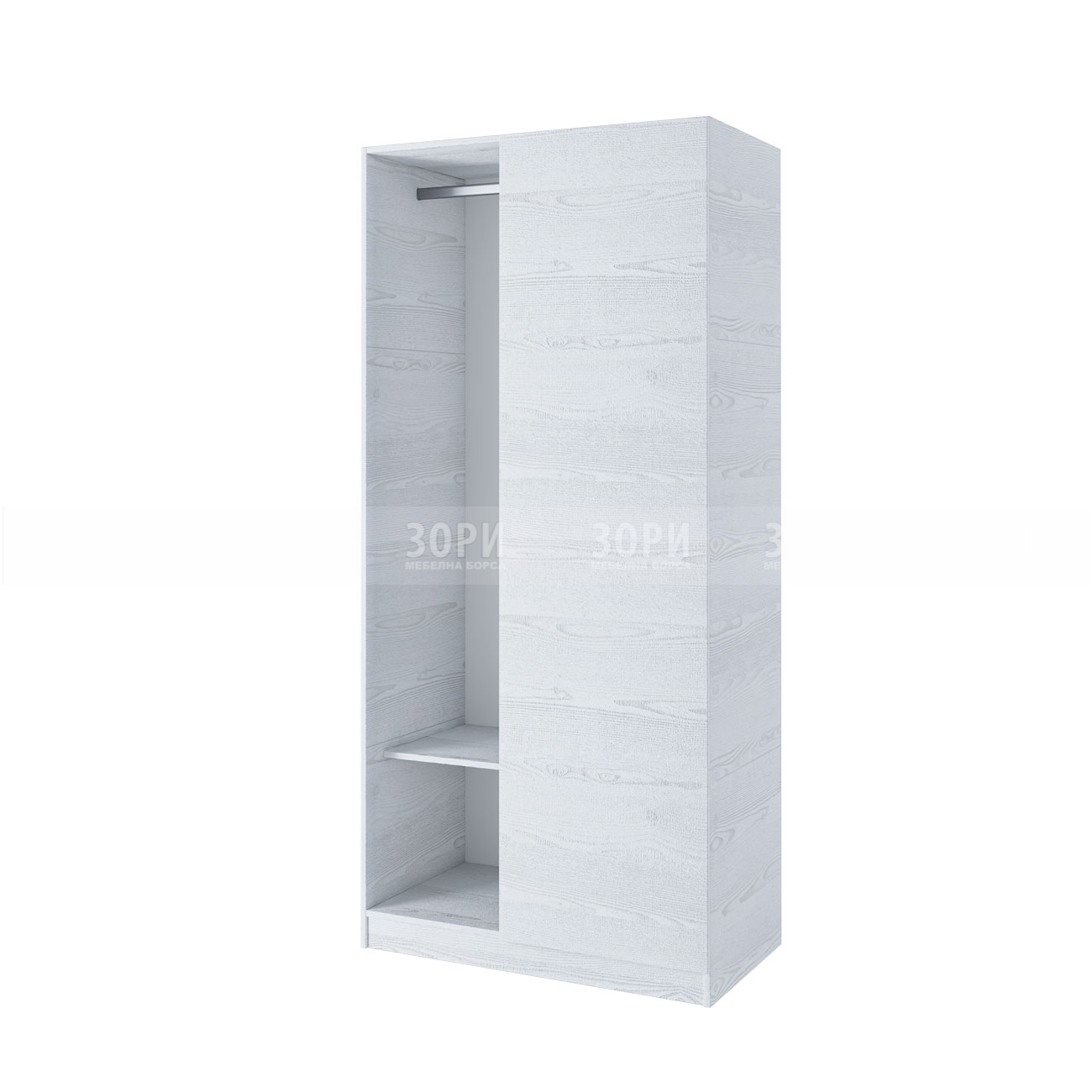 Модула е отворен корпус на гардероб, изработен от ПДЧ с дебелина 16 мм в цвят бяло фладер. Размер: 93/52,5/201 см.