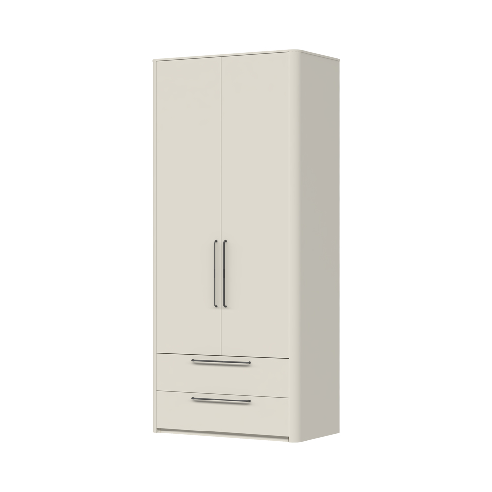 Двукрилен гардероб с две чекмеджета от Колекция Air. Видимите части са изработени от ПДЧ с дебелина 18мм, с покритие UV soft mat лак в цвят Pepper white, корпуса с дебелина 18мм в текстилен декор. Има декоративни заоблени MDF елементи. Гардероба е с метални дръжки в цвят антрацит, механизмите за плавно затваряне са по-устойчиви на износване, осигуряват максимална издръжливост и допълнителен комфорт при ежедневна употреба.