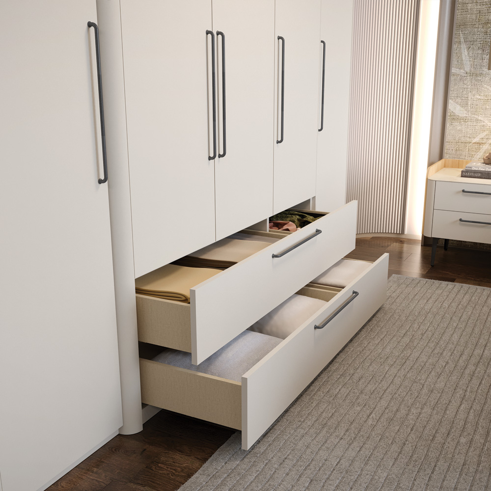 Петкрилен гардероб с две чекмеджета от Колекция Air. Видимите части са изработени от ПДЧ с дебелина 18мм, с покритие UV soft mat лак в цвят Pepper white, корпуса с дебелина 18мм в текстилен декор. Има декоративни заоблени MDF елементи. Гардероба е с метални дръжки в цвят антрацит, механизмите за плавно затваряне са по-устойчиви на износване, осигуряват максимална издръжливост и допълнителен комфорт при ежедневна употреба.