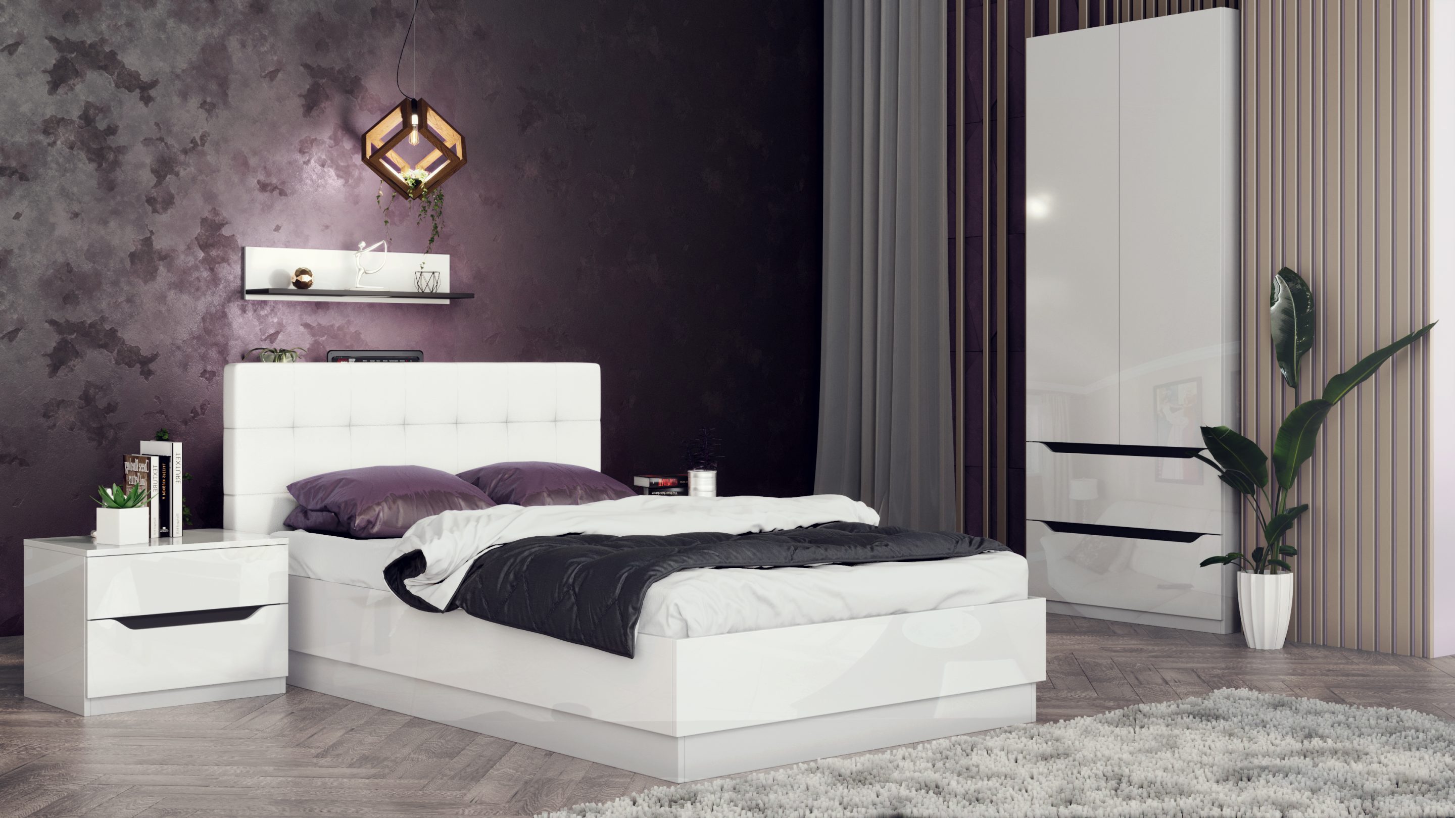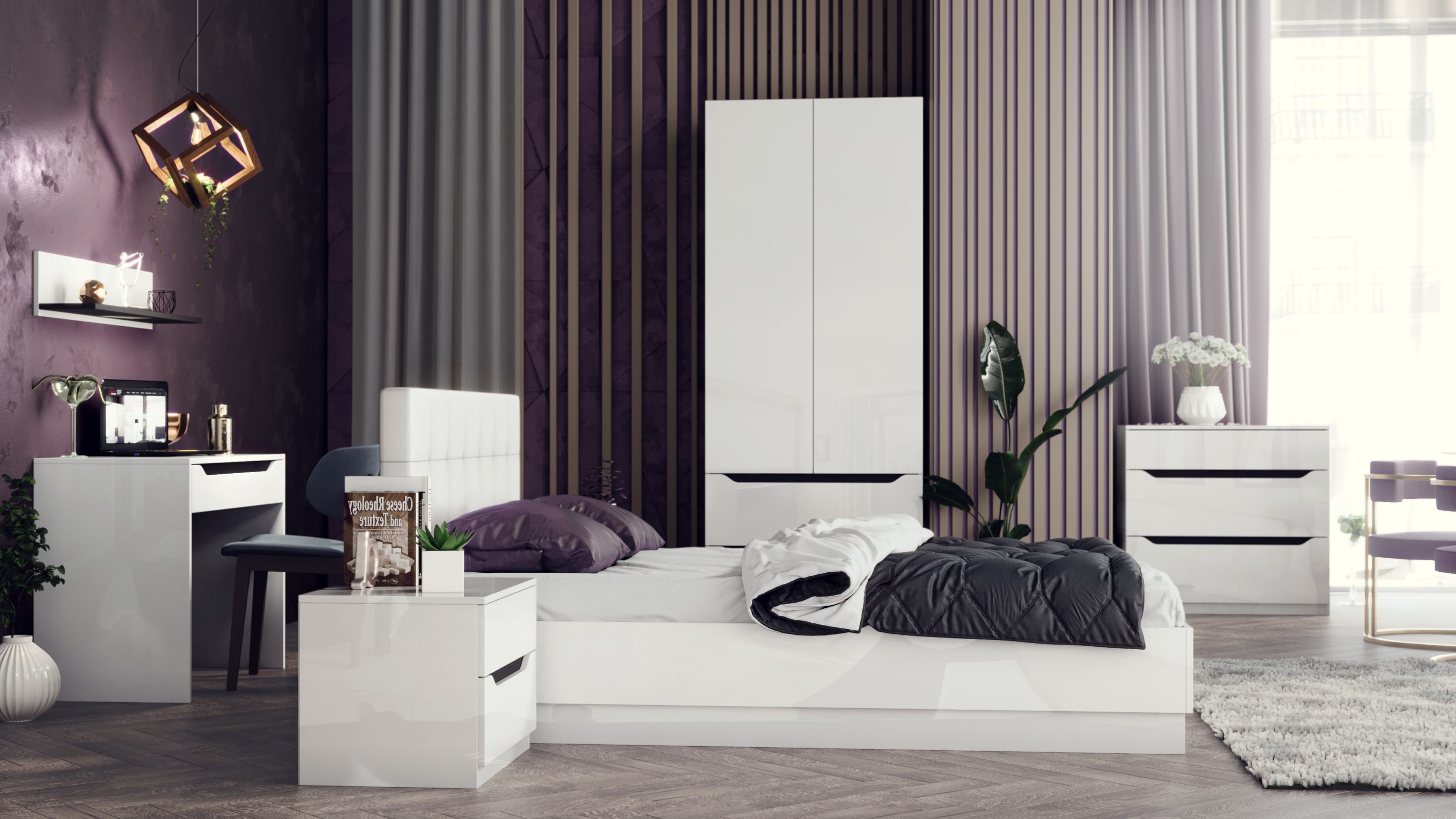 Етажерка за окачване на стена от колекция за обзавеждане на спалня и юношеска стая Аляска, изработен от ПДЧ с дебелина 18мм в бял гланц и графит.