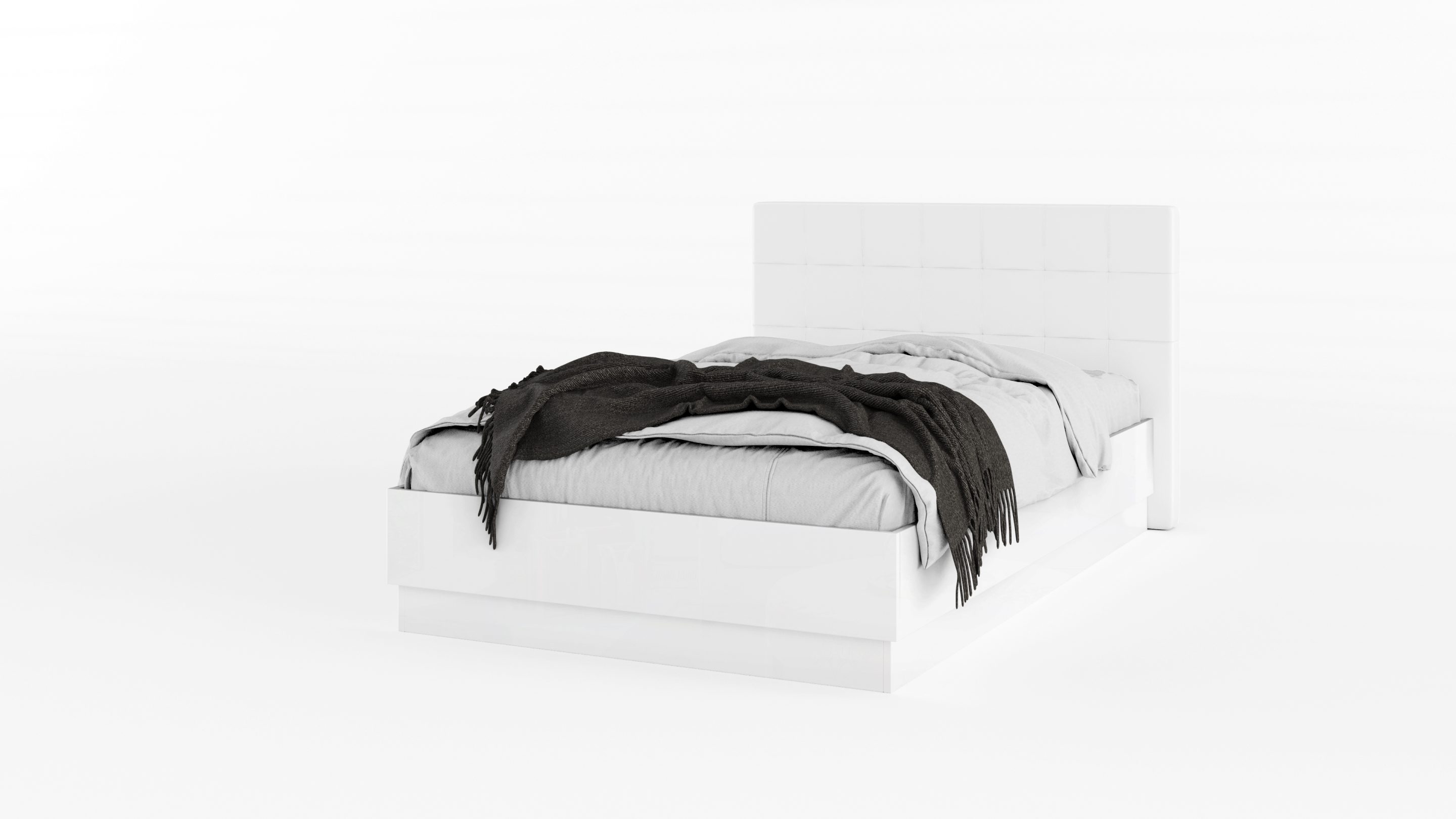 Спалня с тапицирана таблата с еко кожа в бял цвят или графит. Изработена е от ПДЧ 18мм. Спалнята има включени повдигащи амортисьори (странично отваряне) и е подходяща за матрак с размери 120/200. Има възможност за еднолицев и двулицев матрак. Размер: 138/213.5/96 см.