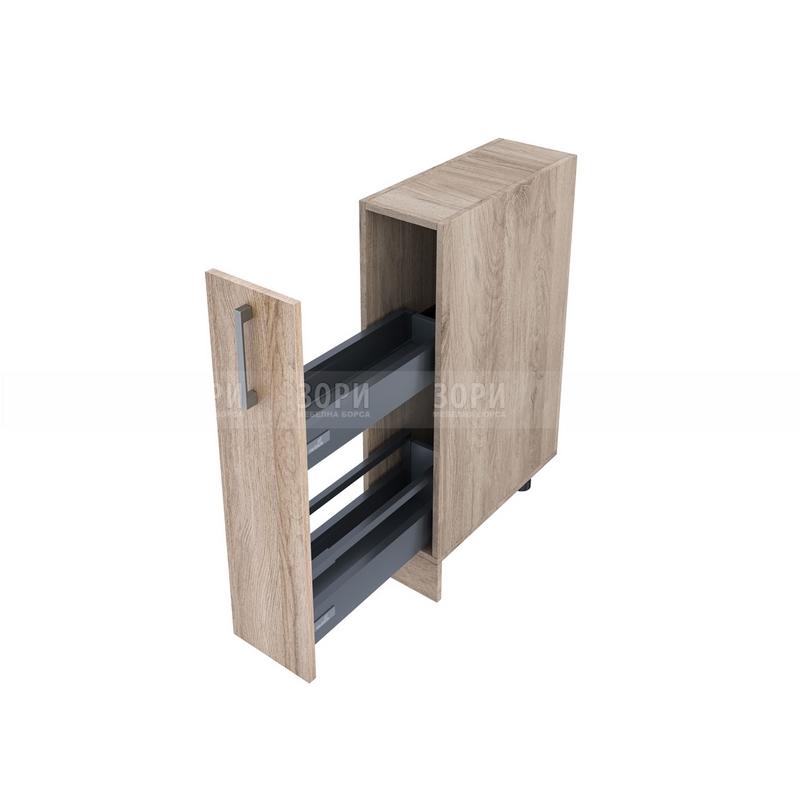 Долен кухненски шкаф бутилиера, изработен от ПДЧ с дебелина 16 мм в цвят сонома арвен и МДФ с дебелина 18 мм в цвят сонома, регулируеми крака 100 мм, система InnoTech Atira /Hettich/ и дръжка по избор.