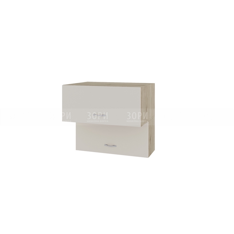Горен кухненски шкаф с две хоризонтални врати (с две дълбочини), изработен от ПДЧ с дебелина 16мм в цвят сонома арвен и сатен, газови амортисьори и дръжки по избор – мат хром или черен мат.