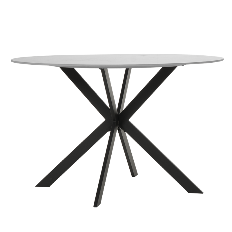 Кръгла трапезна маса с плот от керамика с матова поеърхност, с диаметър 120 см и дебелина 12мм в бял цвят. Краката са от праховобоядисан метал в черно.