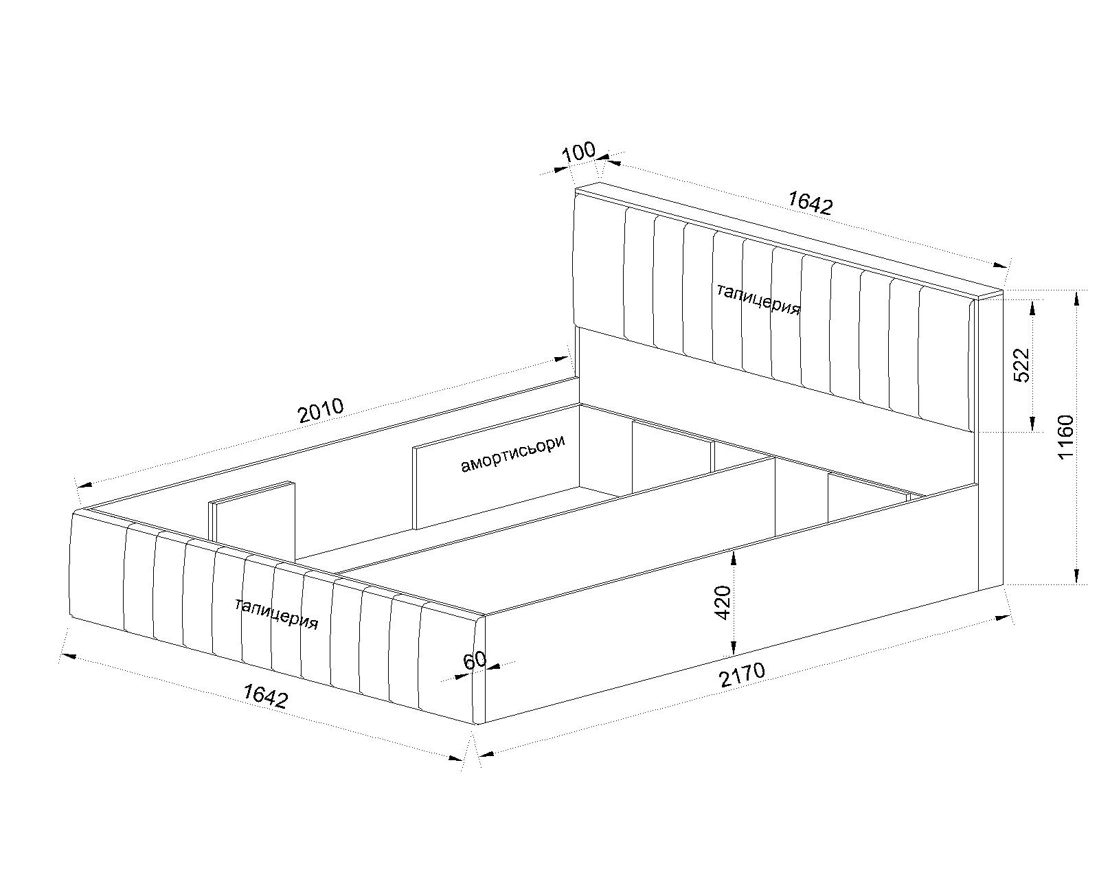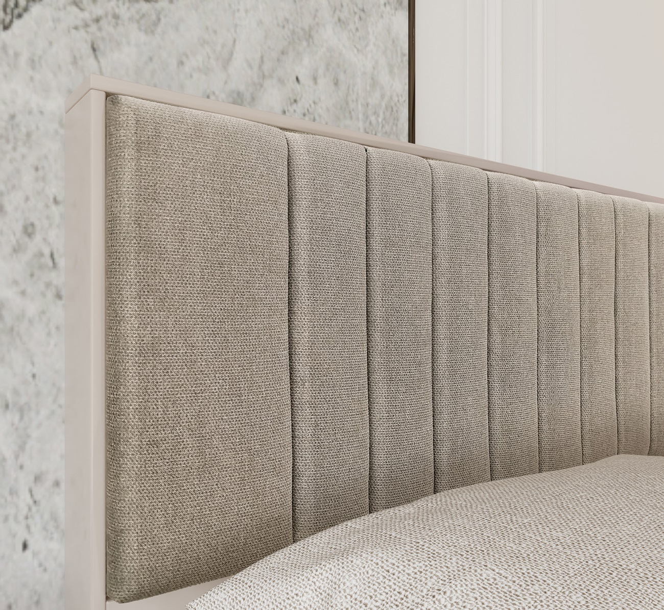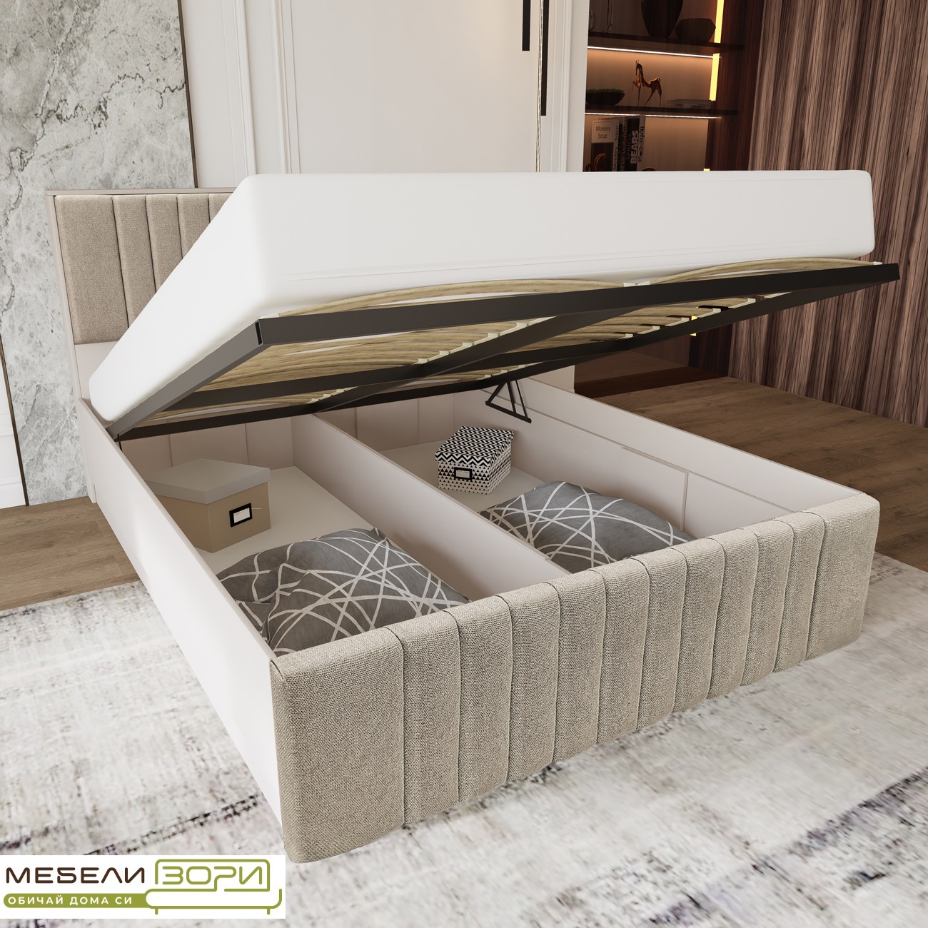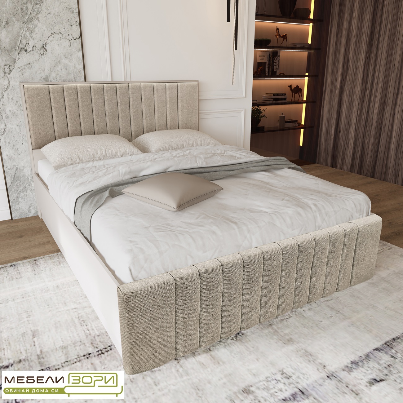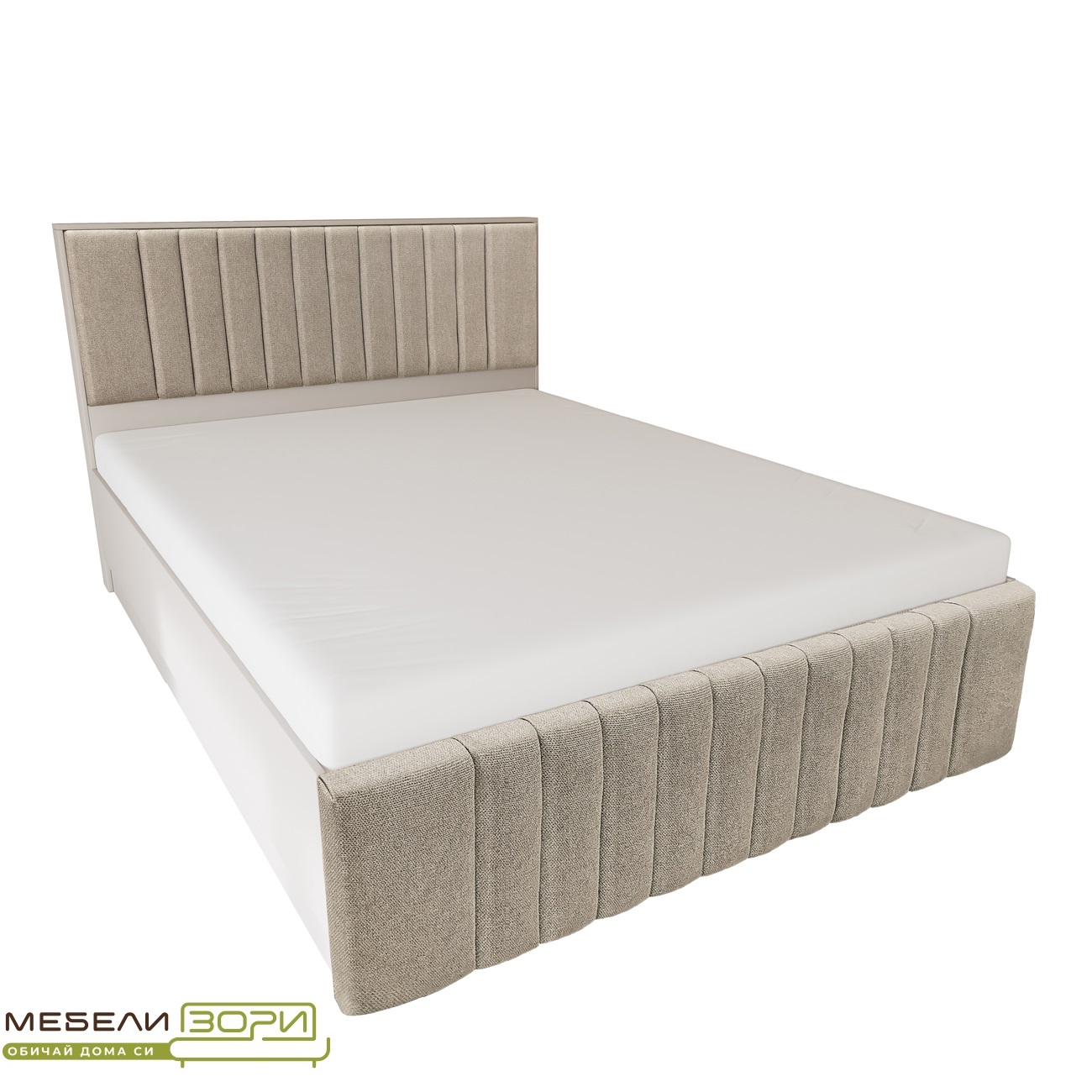 Спалня с тапицерия на двете табли. Изработена от ПДЧ с дебелина 16 мм в цвят кашмир и висококачествен плат в бежов цвят. Спалнята има включени повдигащи амортисьори и е подходяща за матрак с размери 160/200. Има възможност за еднолицев и двулицев матрак. Размер: 164,5/217/117 см.