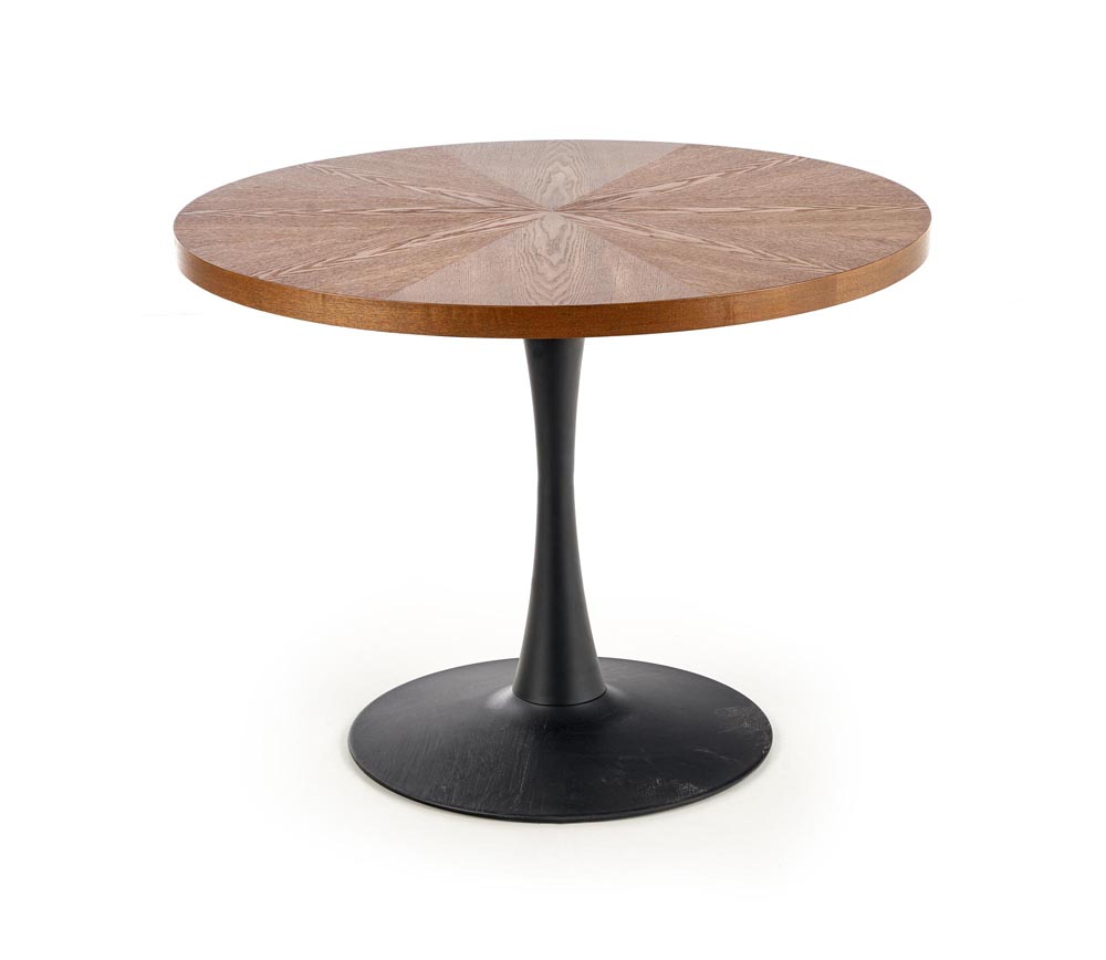 Трапезна маса Carmelo с фиксиран размер Ф100/Н75. Плотът е изработен от МДФ + естествен фурнир в цвят орех. Основата на маса е от праховобоядисан метал в черен цвят.