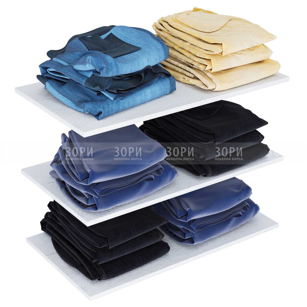 Комплект от 3 броя рафтове за гардероб Dress 80, изработени от ПДЧ с дебелина 16 мм в цвят бяло фладер. Размер: 76,8/42/1,6 см.