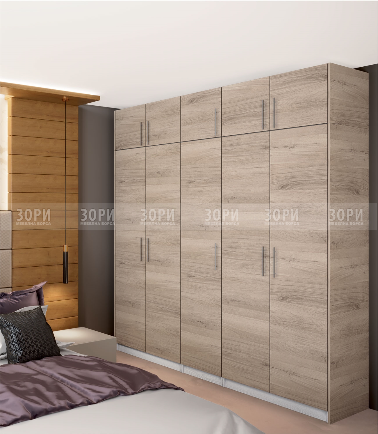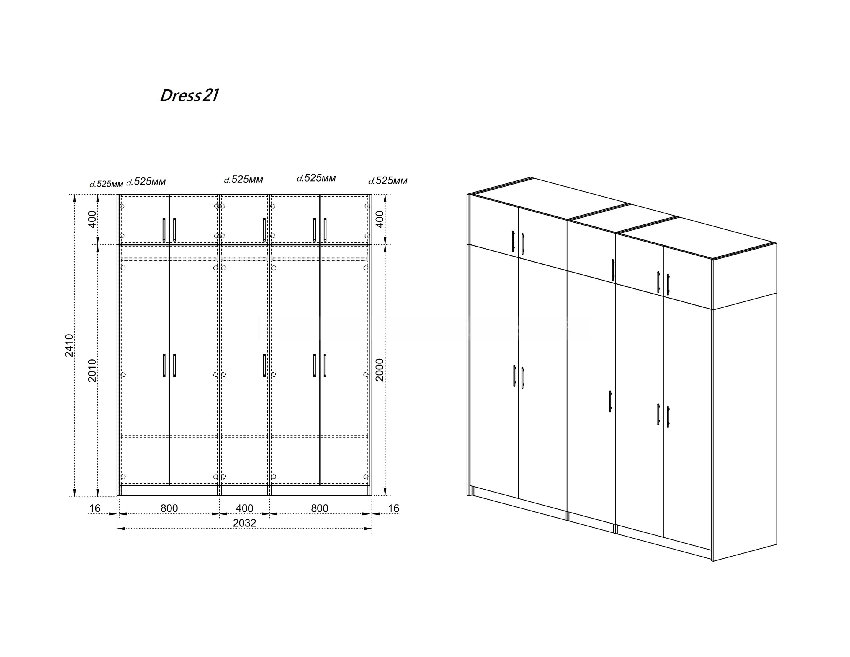Dress 21 е готова конфигурация от Колекция Dress, гардероб с пет крила с надстройка. Изработен от ПДЧ с дебелина 16 мм в цвят бяло фладер и МДФ бяло гланц. Размер: 200/52,5/241 см.