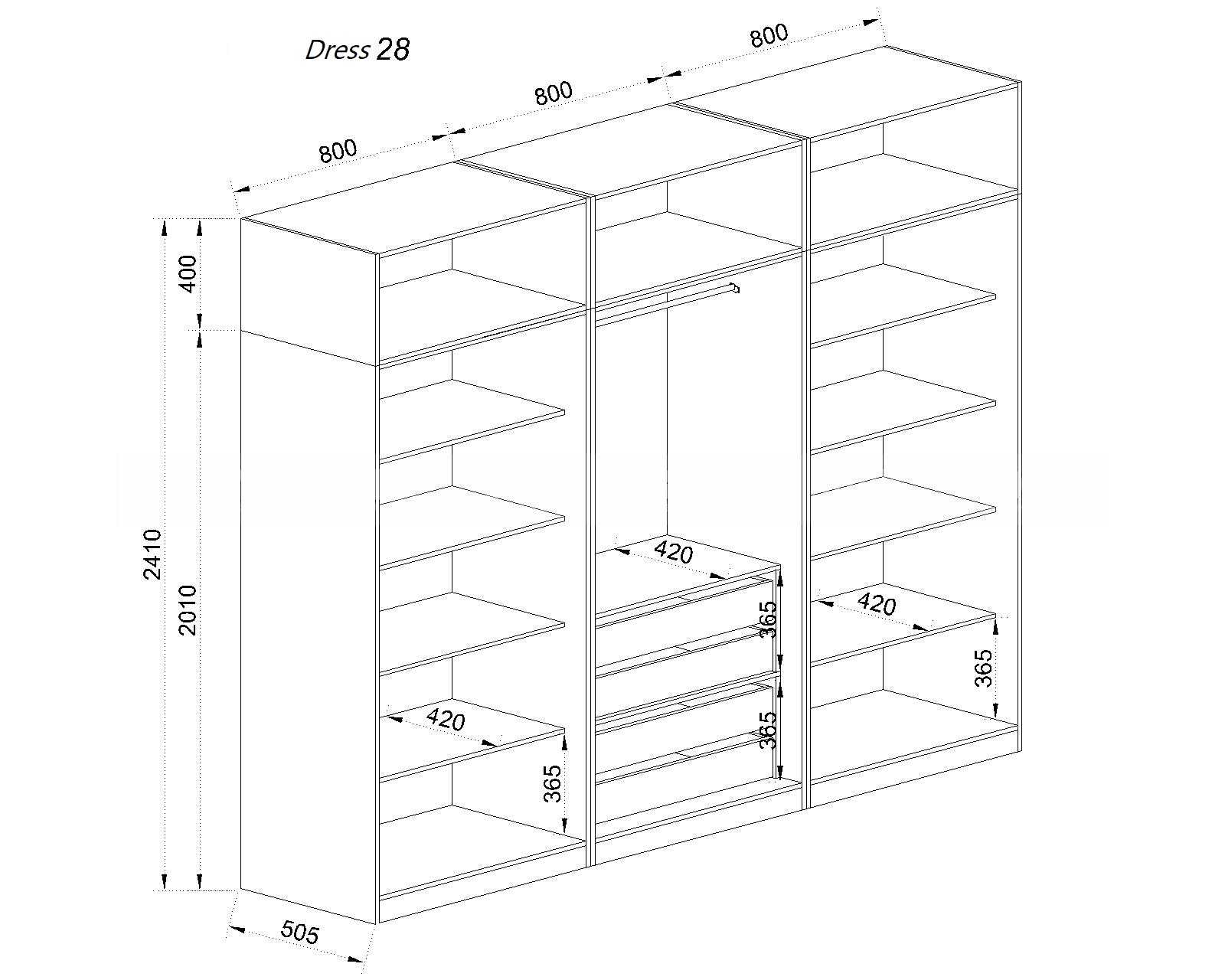 Dress 28 е отворен корпус на гардероб, изработен от ПДЧ с дебелина 16 мм в цвят бяло фладер. Размер: 240/50,5/241 см.