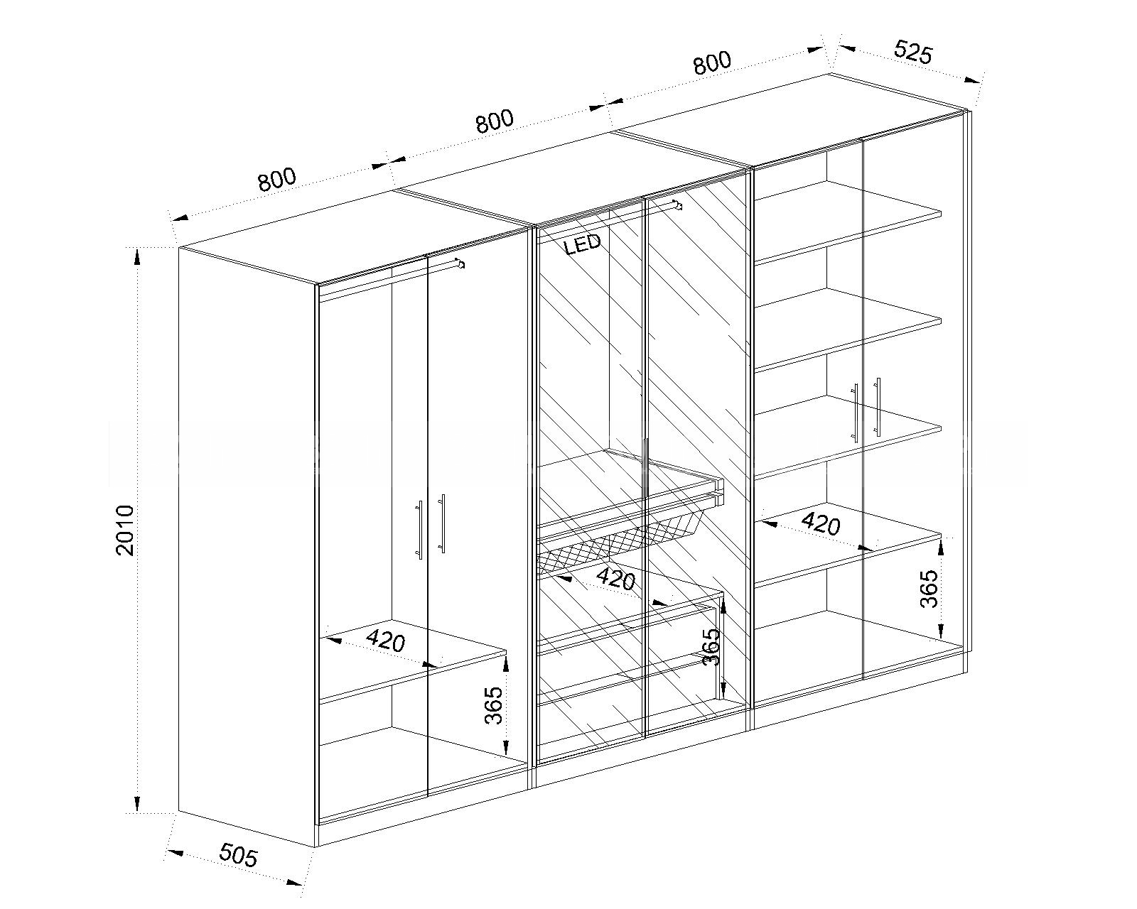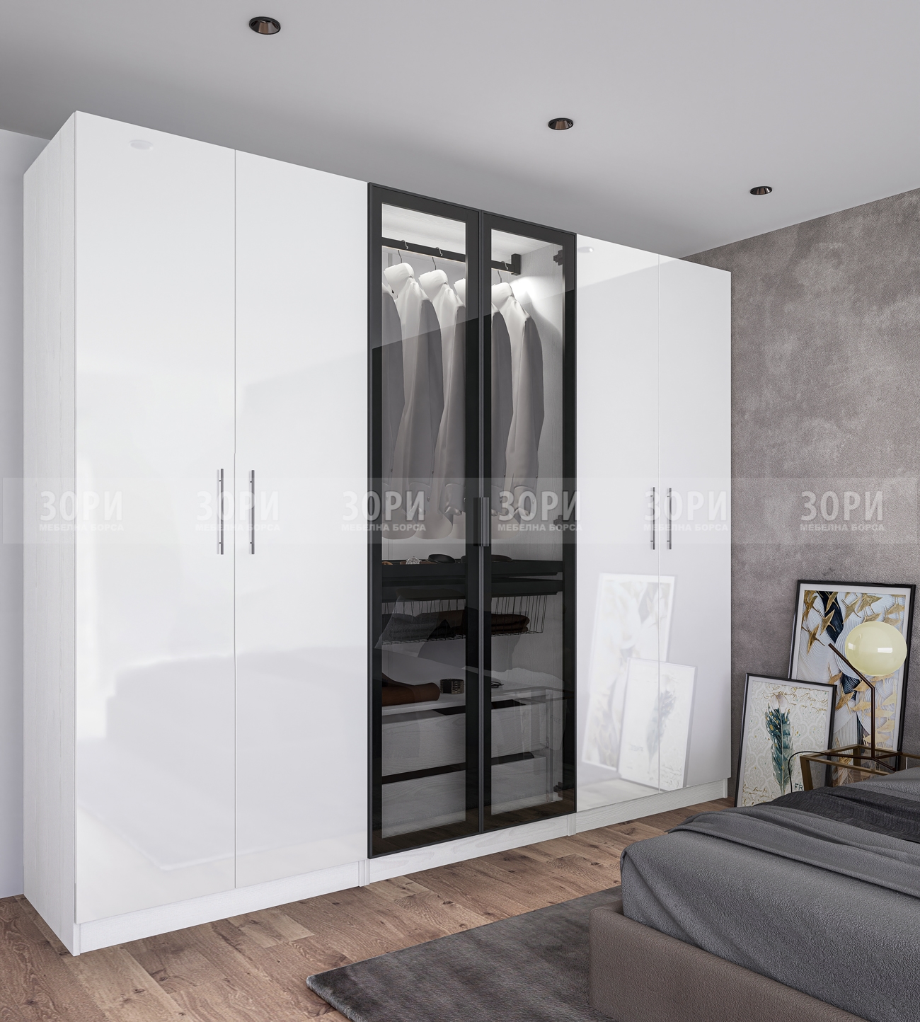 Dress 37 е готова конфигурация от Колекция Dress, гардероб с шест крила ( 4 плътни и две стъклени ). Изработен от ПДЧ с дебелина 16 мм в цвят бяло фладер и МДФ бяло гланц, закалено стъкло и метална кошница и рафт. Размер: 240/52,5/201 см.