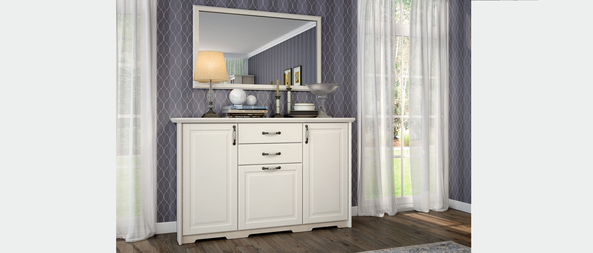 Скрин с три врати и две чекмеджета, с плавно затваряне в ретро стил Evergreen. Лицевата част е изработена от МДФ с UV лак с мек матов ефект в цвят слонова кост. Дизайнът е завършен от декоративни лайсни с дебелина 25мм. Корпусът е изработен от ПДЧ с дебелина 18мм в цвят полярен бор. Механизмите за плавно затваряне са по-устойчиви на износване, осигуряват максимална издръжливост и допълнителен комфорт при ежедневна употреба. Има регулируеми крачета за нивелиране върху неравни повърхности, както и декоративни метални дръжки.
