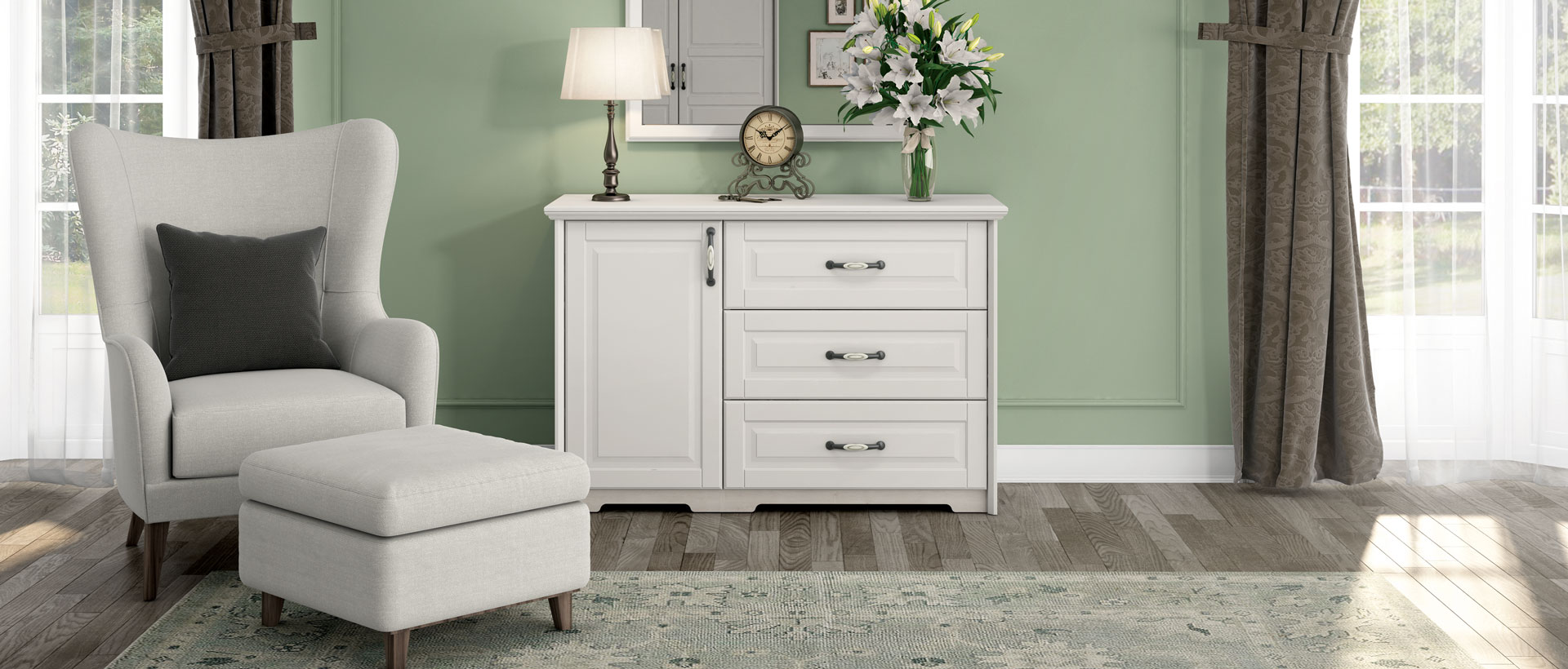 Скрин с една врата и три чекмеджета, с плавно затваряне в ретро стил Evergreen. Лицевата част е изработена от МДФ с UV лак с мек матов ефект в цвят слонова кост. Дизайнът е завършен от декоративни лайсни с дебелина 25мм. Корпусът е изработен от ПДЧ с дебелина 18мм в цвят полярен бор. Механизмите за плавно затваряне са по-устойчиви на износване, осигуряват максимална издръжливост и допълнителен комфорт при ежедневна употреба. Има регулируеми крачета за нивелиране върху неравни повърхности, както и декоративни метални дръжки.