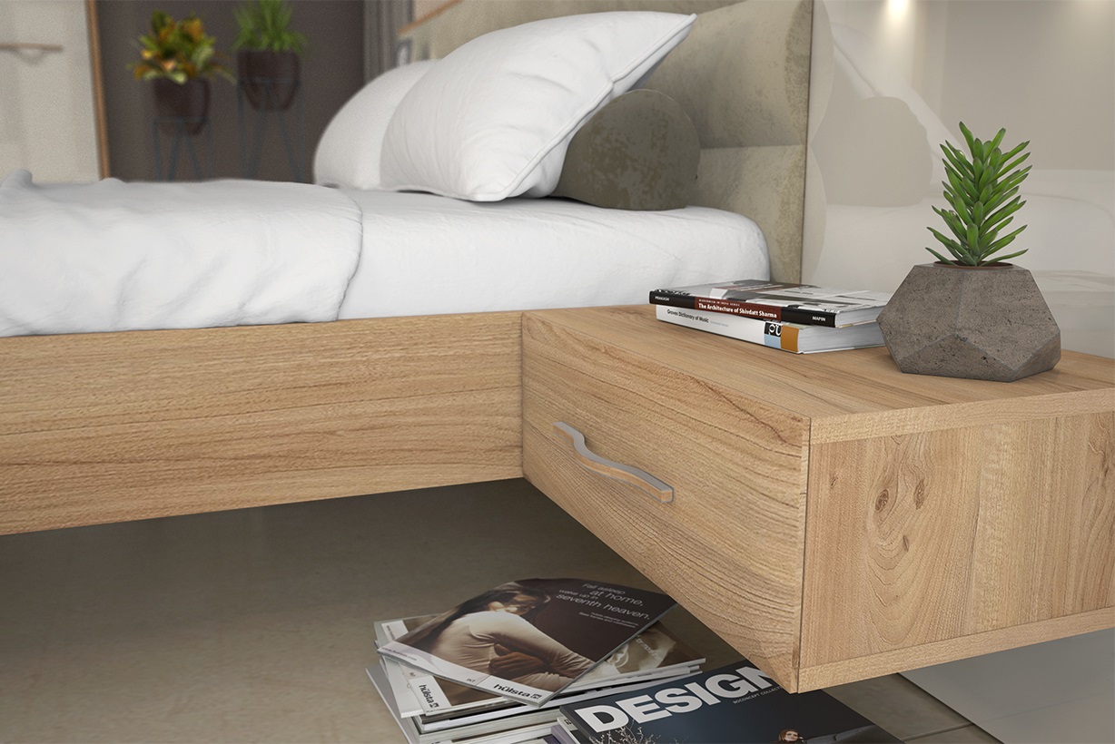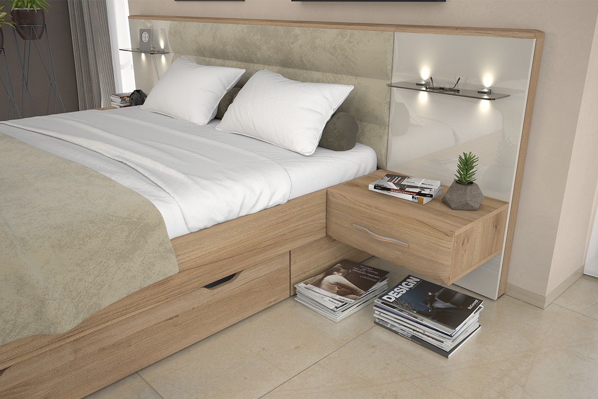 Спален комплект с петкрилен гардероб и легло с чекмеджета от Колекция Гала. Вратите на гардероба са покрити с UV лак в бежов цвят, челата на чекмеджетата са от МДФ в дървесен декор, има включени странични и таванни ивици с дебелина 25мм в дървесен декор с LED осветление. Механизмите за плавно затваряне са по-устойчиви на износване, осигуряват максимална издръжливост и допълнителен комфорт при ежедневна употреба. Вътрешната част е в бял цвят. Нощните шкафчета имат включено LED осветление. Леглото е с тапицирана табла и две чекмеджета. Има включена твърда основа за матрак. Леглото е подходящо за матрак с размер 160/200 см.