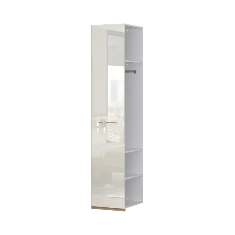 Допълнителен еднокрилен гардероб от Колекция Гала. Той не може да се монтира самостоятелно, трябва да е в комбинация с гардероб Гала P22/GL или P32/GL. Вратата е покрита с UV лак в бежов цвят. Дръжката имат елемент в дървесния декор. Механизмите за плавно затваряне са по-устойчиви на износване, осигуряват максимална издръжливост и допълнителен комфорт при ежедневна употреба. Допълнителният гардероб е с три рафта, вертикален разделителен панел в бял цвят, един лост за закачалки и регулируеми крачета за нивелиране върху неравни повърхности.