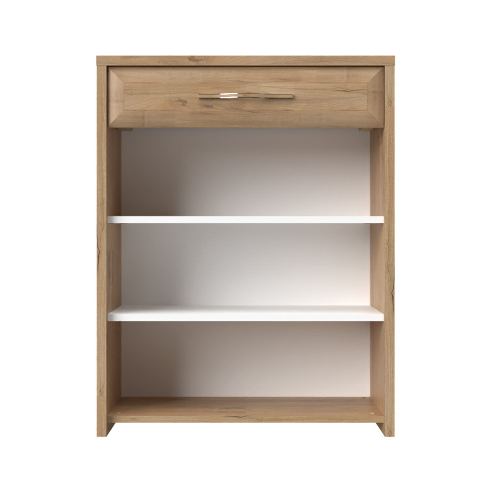 Функционален шкаф за обувки с две врати и едно чекмедже от Колекция Гала. Вратите са покрити с UV лак, четири пъти по-устойчив на физически повреди в сравнение със стандартното лакиране. Челата на чекмеджетата са от профилиран МДФ в дървесен декор. Корпус до 25 мм, хромирани дръжки, механизми за плавно затваряне.