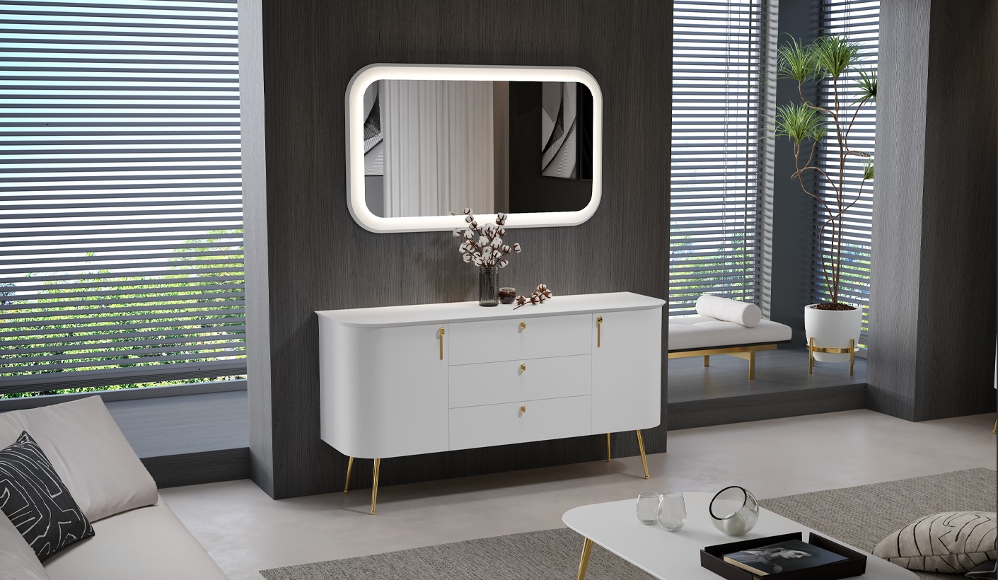 Скрин Galet, изцяло боядисан с бял матов UV лак, с две врати и чекмеджета: