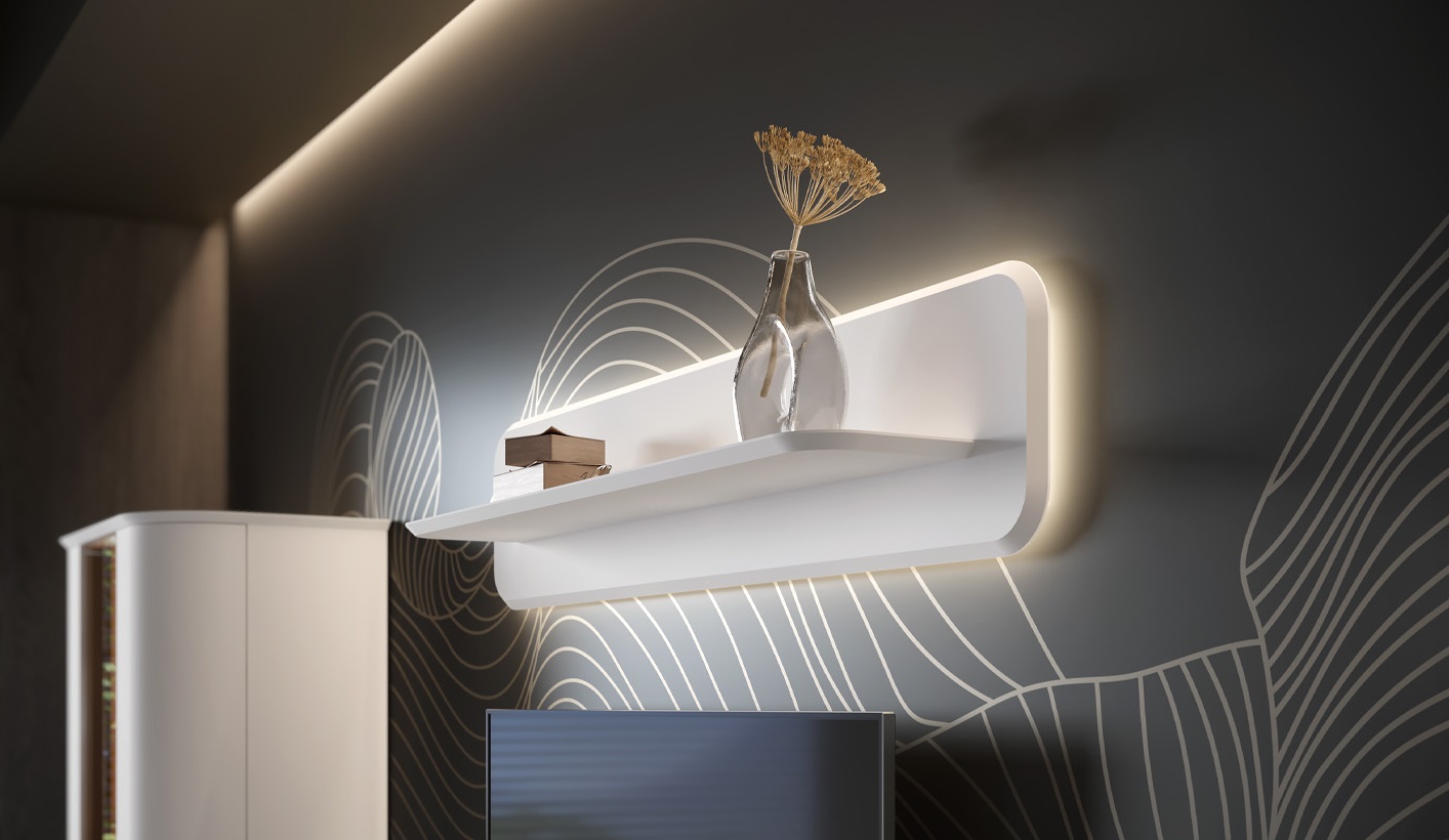 Стенна етажерка с осветление Galet, изработена от МДФ 18 мм със скосени ръбове, в бял мат UV лак.