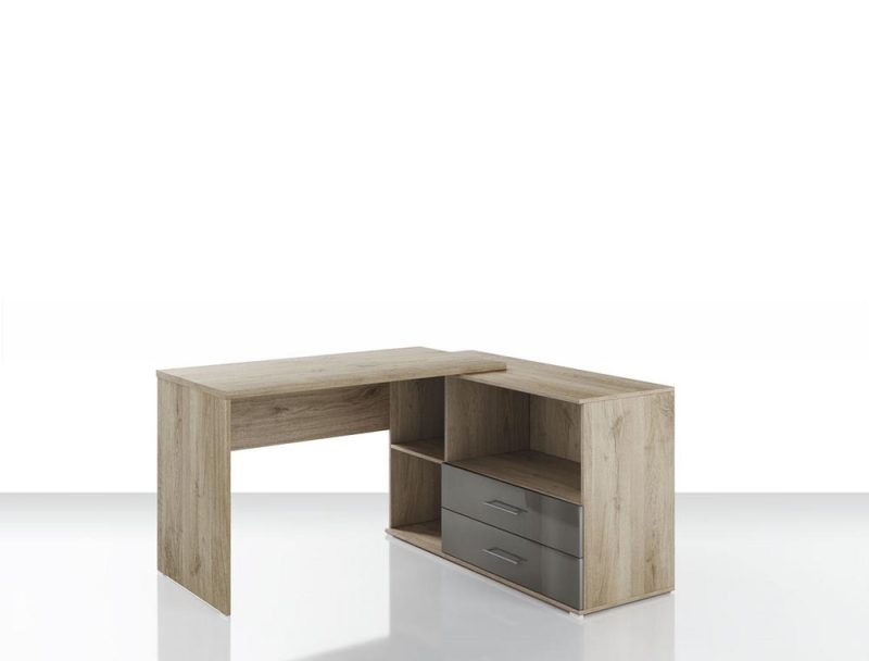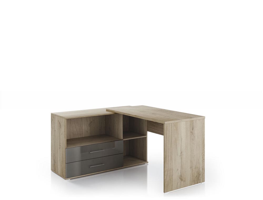 Ъглово бюро от Колекция Гранд с дебелина на плота 25мм. Има две чекмеджета, които вътре са с бели кутии и ролкови водачи. Бюрото има възможност за огледален монтаж. Изработено е от ПДЧ и МДФ с дебелина 16мм,25мм в цвят сонома арвен и кобалт гланц. Размер: 143,5/127/75 см.