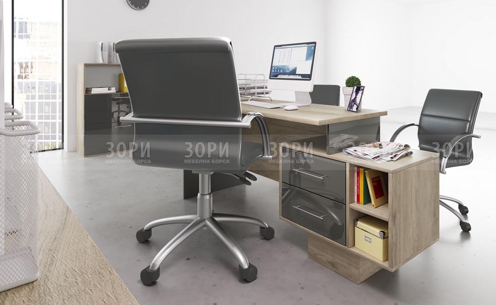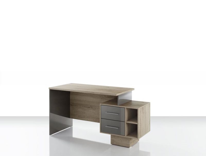 Бюро с две чекмеджета и две ниши от Колекция Гранд. Чекмеджетата са с бели кутии и ролкови водачи. Плотът е с дебелина 25мм. Има възможност за огледален монтаж. Изработено е от ПДЧ и МДФ с дебелина 16мм,25мм в цвят сонома арвен и кобалт гланц. Размер: 148/60/75 см.