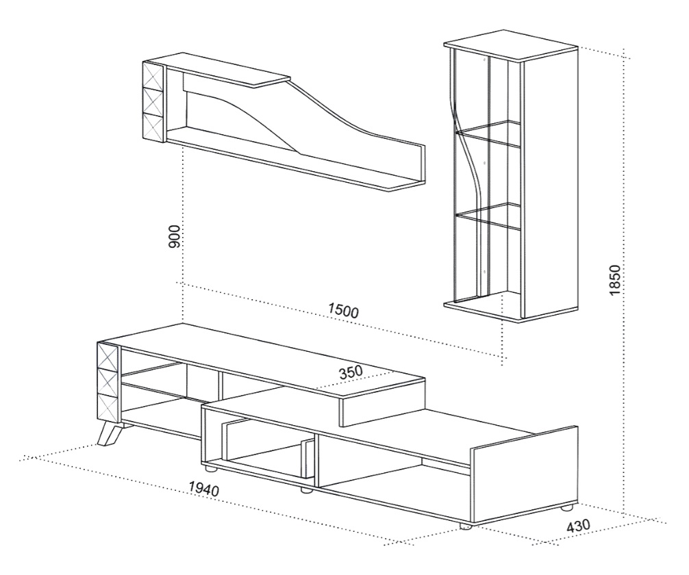 Секция Гранд е комплект от три модула - витрина за окачване, полица и шкаф за телевизор с чекмедже, падаща врата и отворени рафтове. Има ПВЦ орнамент черен сатен. Изработена от ПДЧ с дебелина 16 мм в цвят дъб канзас и черно.