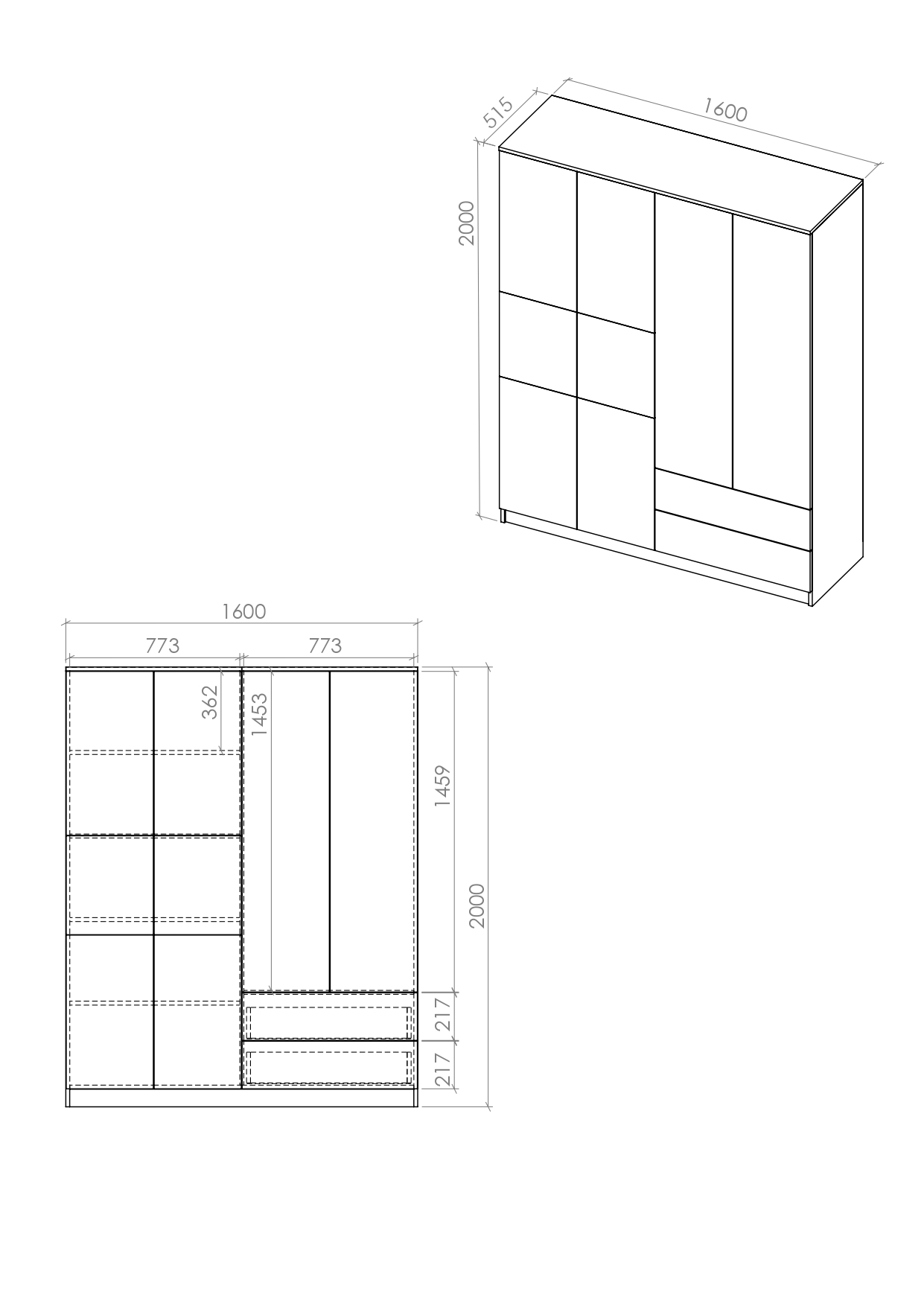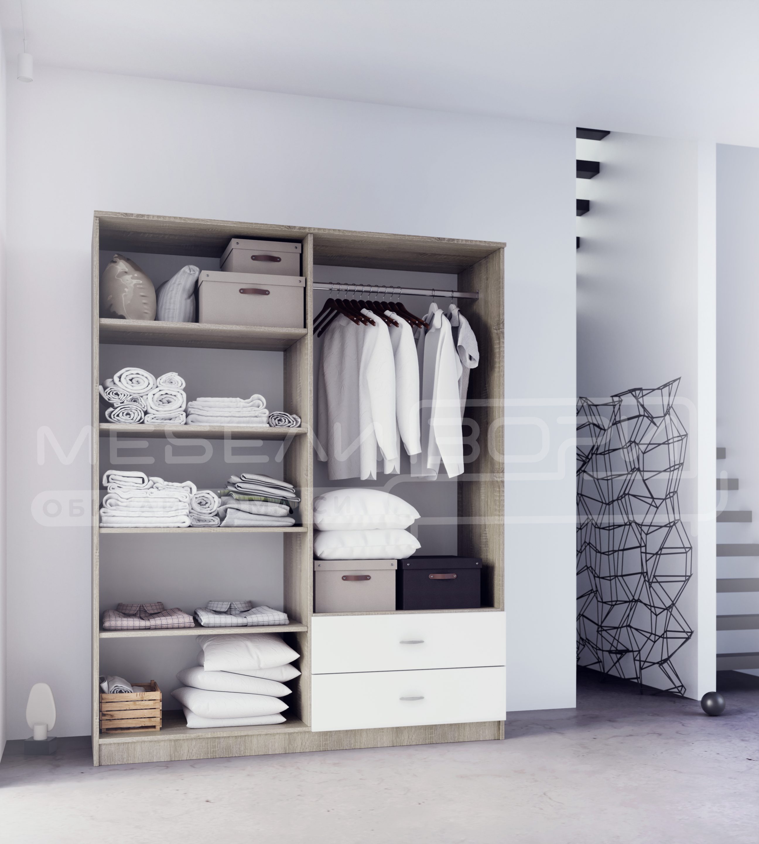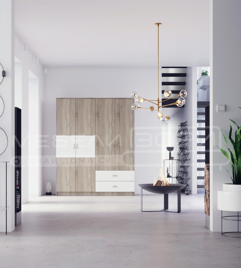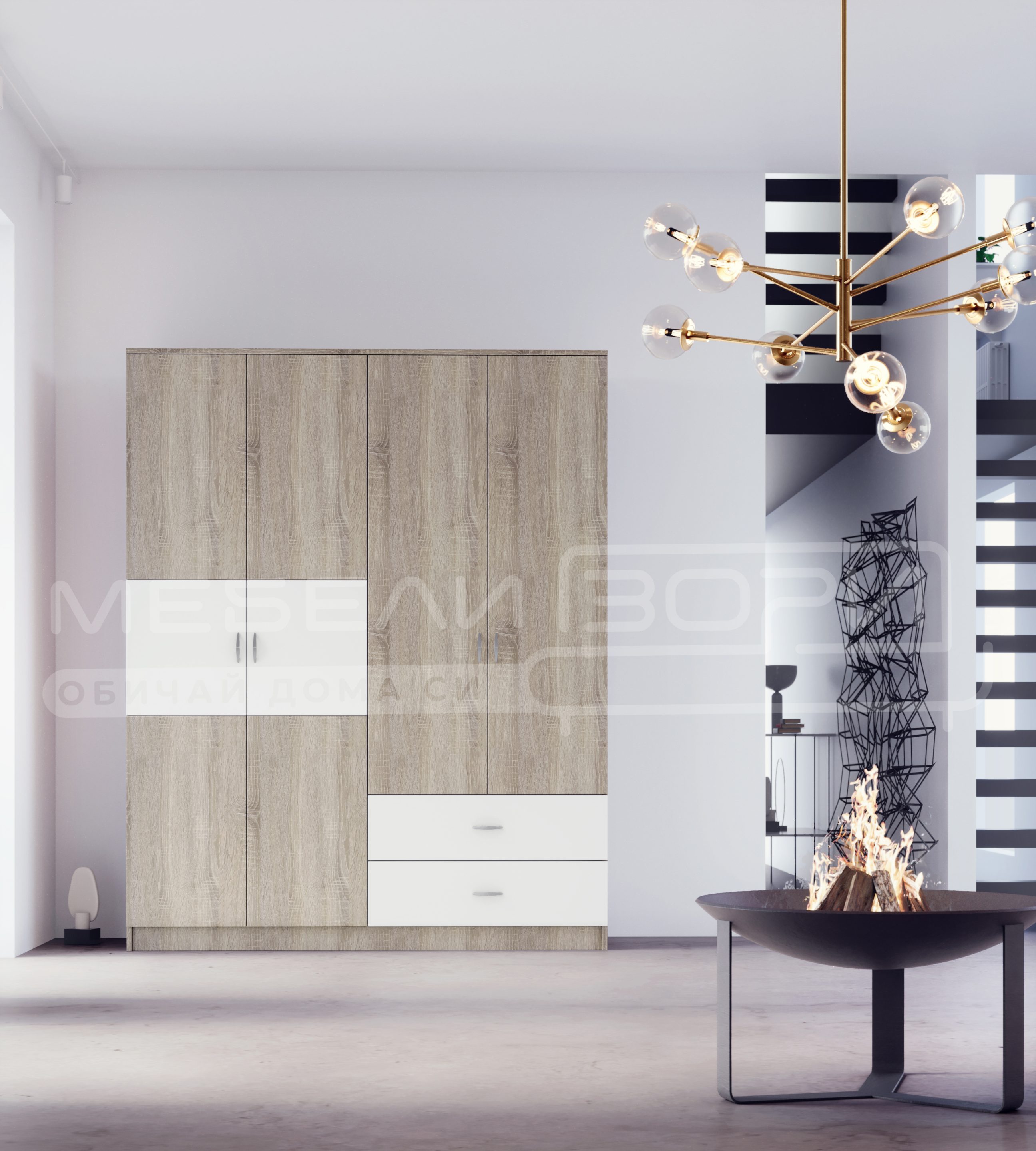 Функционален гардероб с четири врати и две чекмеджета, изработен от ПДЧ с дебелина 18мм в цвят тъмна сонома и бяло гладко. Вътрешно разпределение: две чекмеджета и лост за закачалки, 4 рафта. Гардероб Ивон може да бъде изработен в друг цвят.