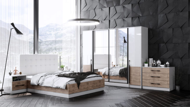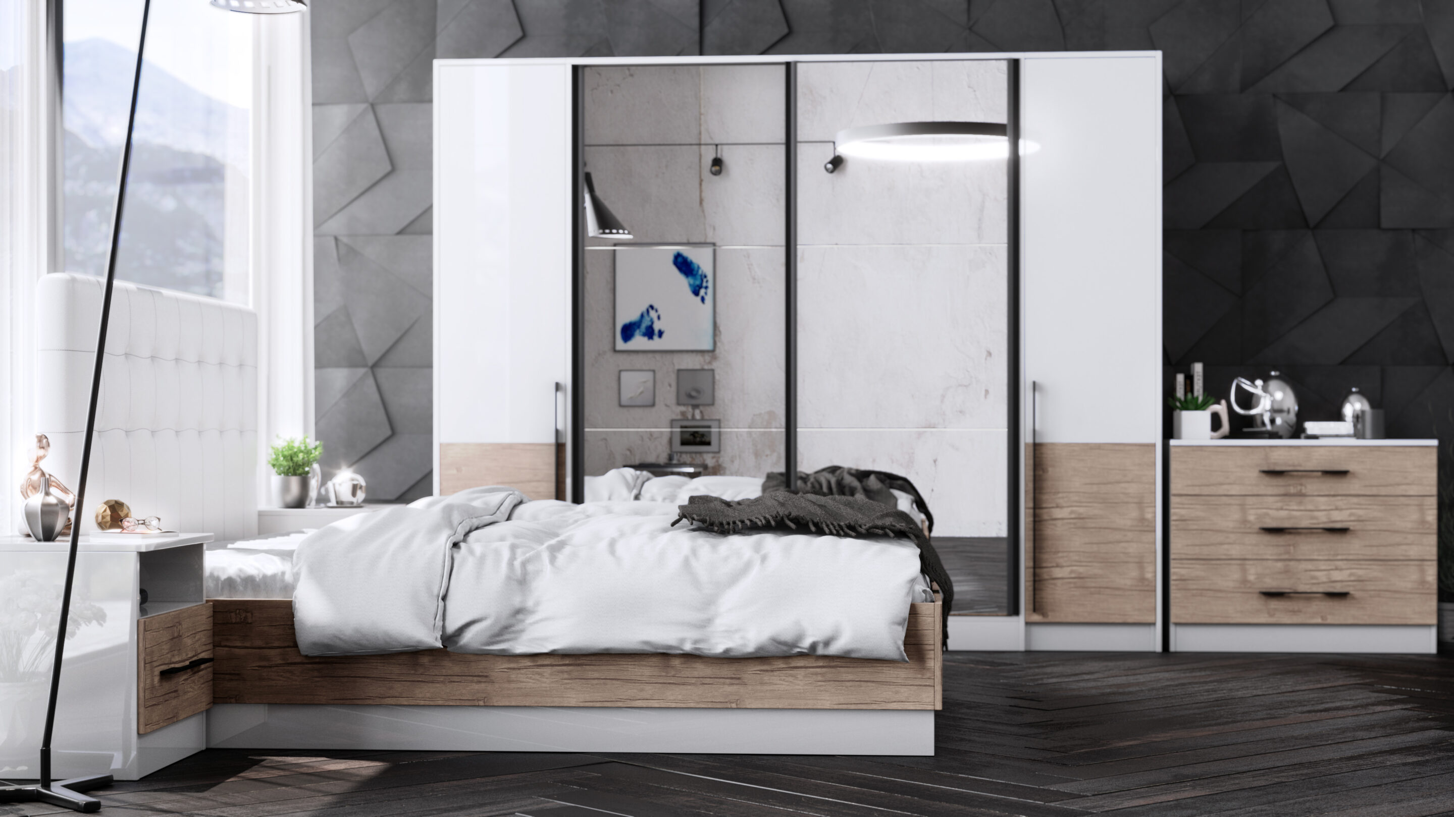 Леглото е подходящо за еднолицев и двулицев матрак с подматрачна рамка с размер 160/200 см. Гардеробът е с практично вътрешно разпределение - двете крайни врати имат по 4 рафта, а в плъзгащата част има два лоста и 4 рафта.