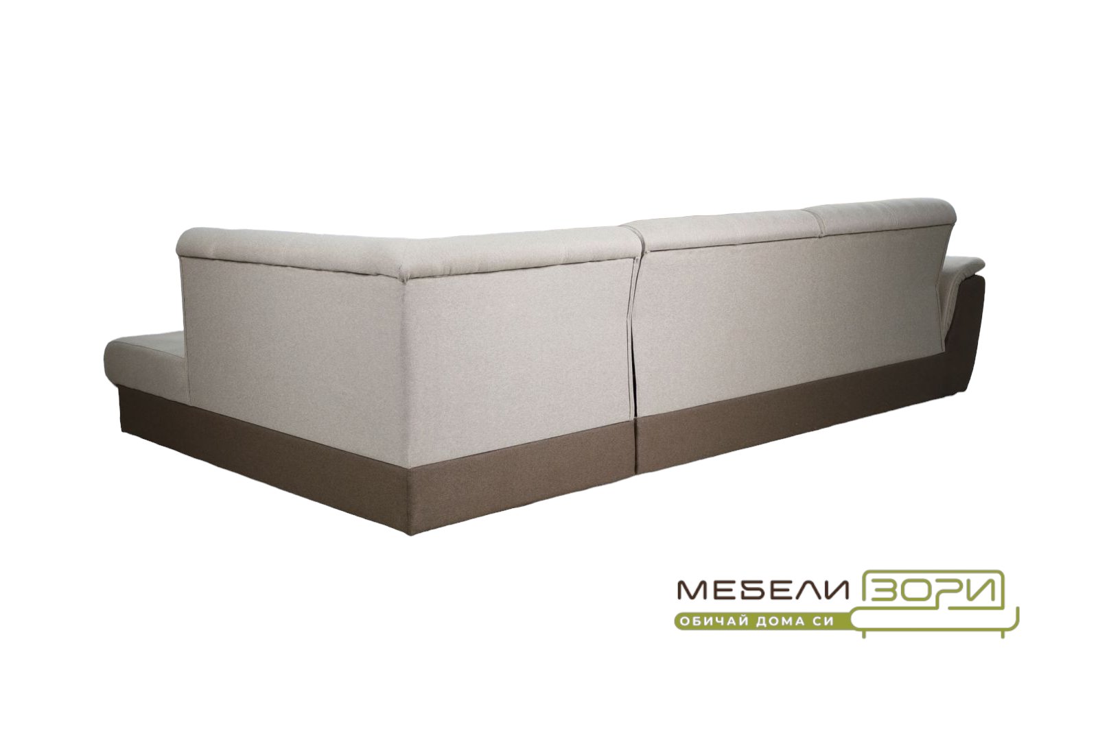 Холов ъгъл Калиифорния е елегантен и функционален. Изработен е с тапицерски колани. Има две ракли, три декоративни възглавници, тапициран гръб и функция сън, посредством клик-клак механизъм. Изработен е в топъл бежов цвят Metro 11 и кафяво Metro 24.