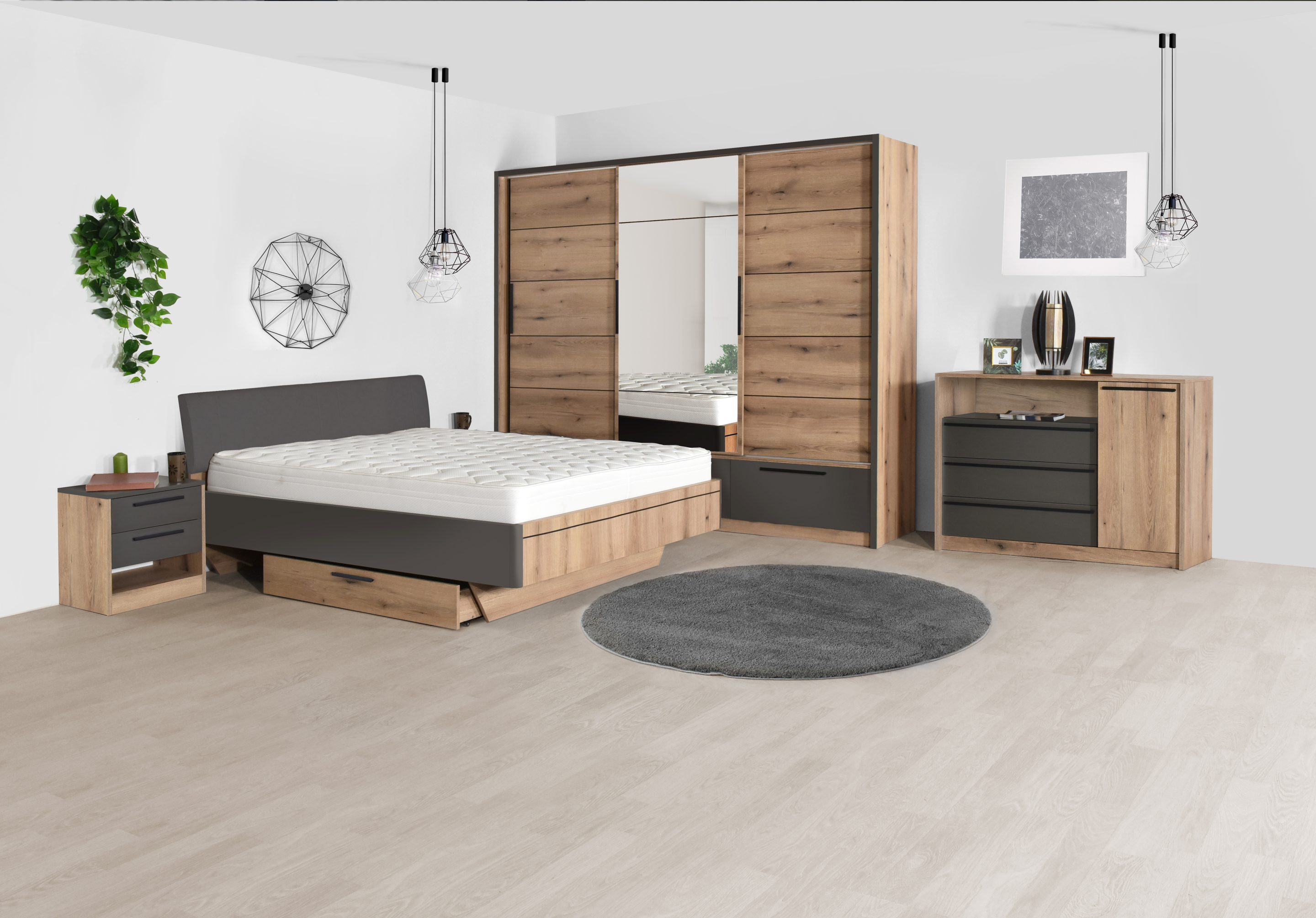 Калиопа 230 дъб артисан и сиво Гардероб с три плъзгащи врати и три чекмеджета