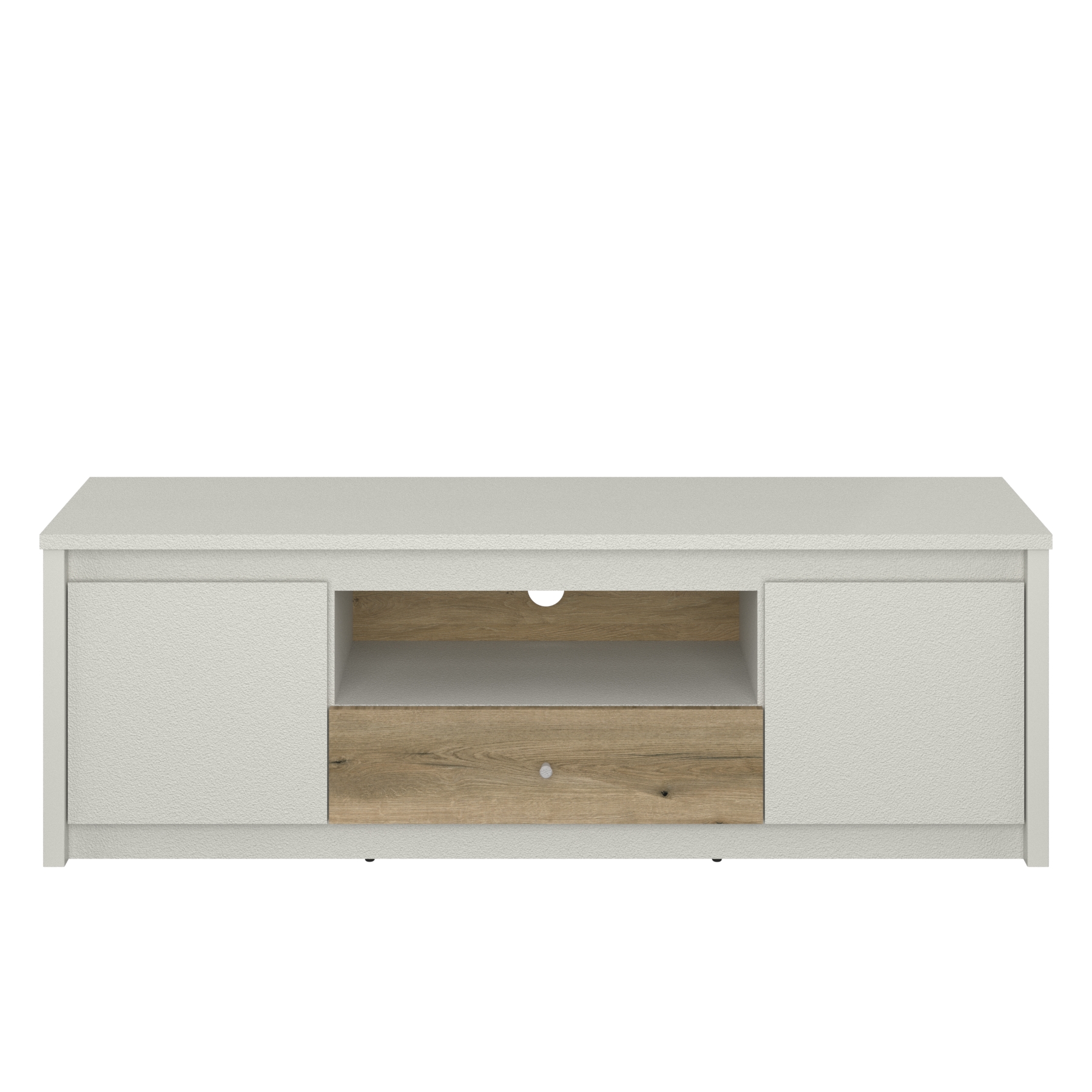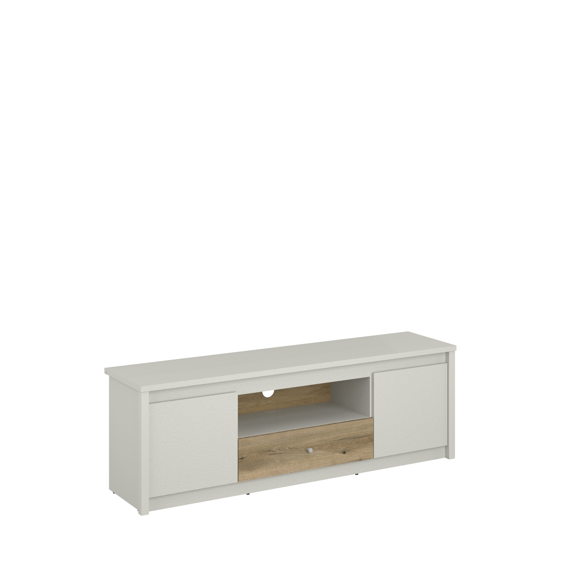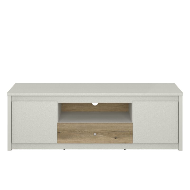 Тв шкаф с две врати, чекмедже и ниша от Колекция Karin. Изработен от ПДЧ в комбинация от топли цветове кашмир и дъб евок. Размер: 150/36,5/50 см.