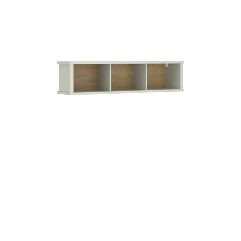 Етажерка за стена с три ниши от Колекция Karin. Изработена от ПДЧ в комбинация от топли цветове кашмир и дъб евок. Размер: 126/22/30,5 см.