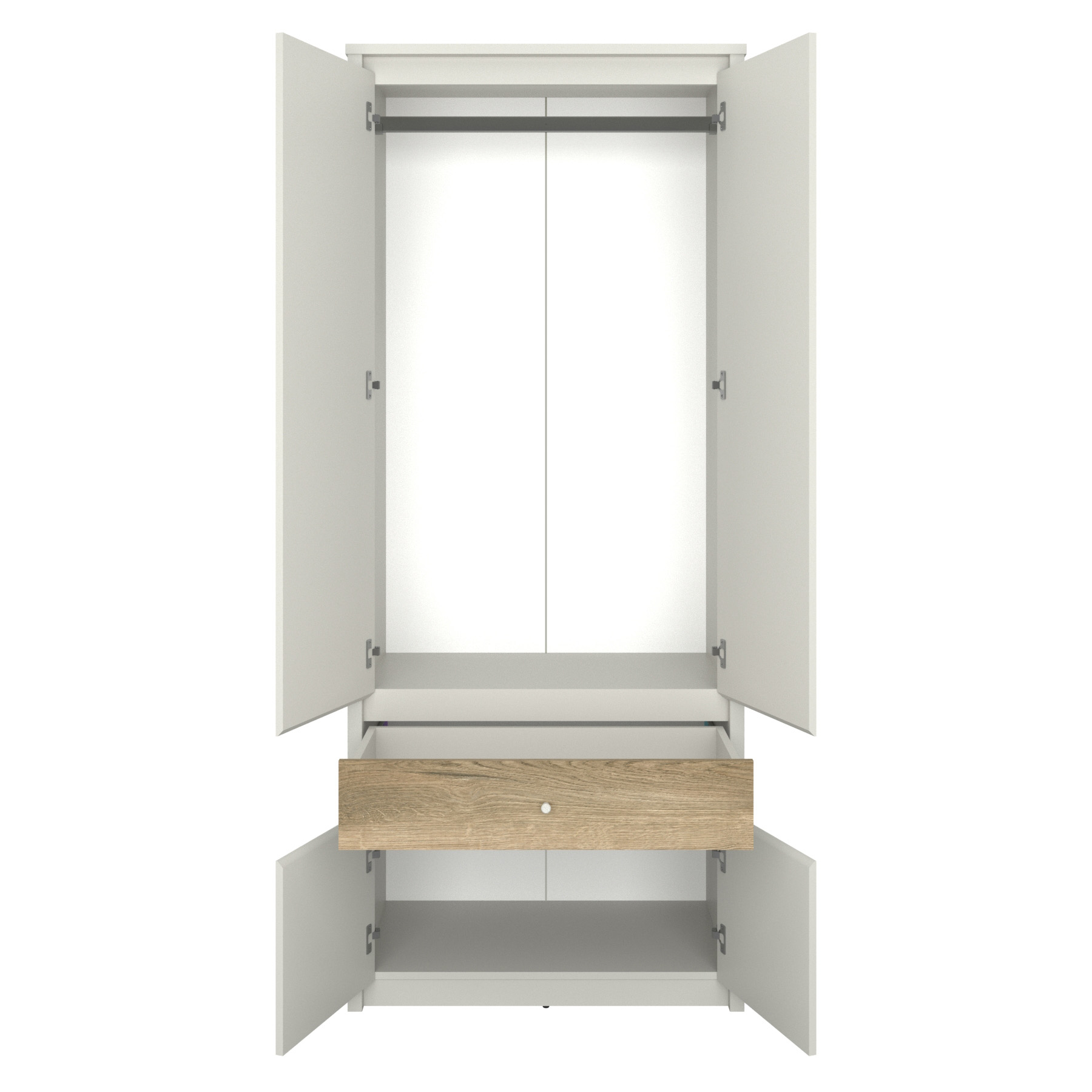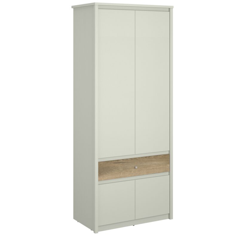 Гардероб с четири врати и едно чекмедже от Колекция Karin. Изработена от ПДЧ в комбинация от топли цветове кашмир и дъб евок. Размер: 87/50,5/210,5 см.