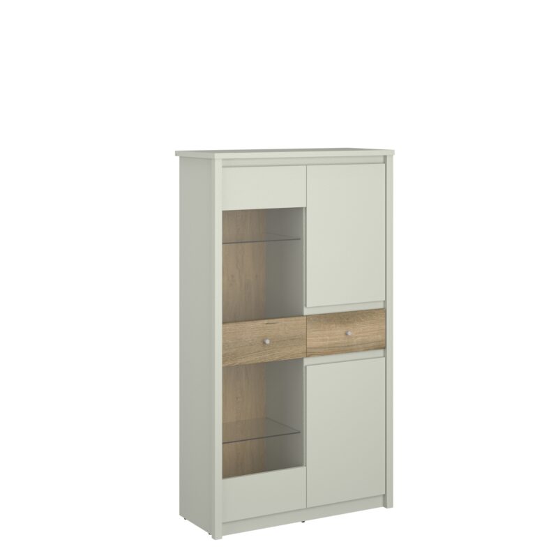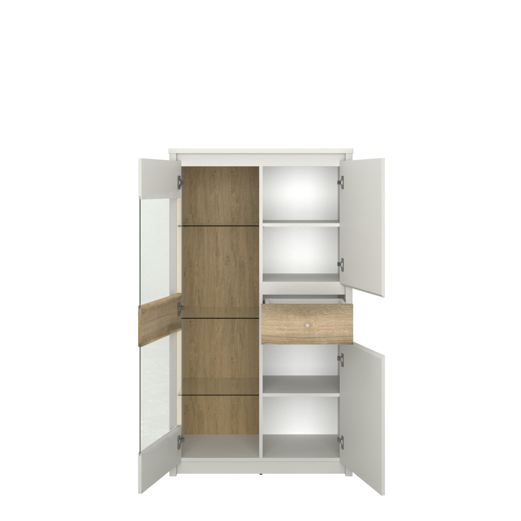 Витрина за дневна с чекмедже, две плътни и една стъклена врата от Колекция Karin. Изработена от ПДЧ в комбинация от топли цветове кашмир и дъб евок. Размер: 86/36,5/153 см.