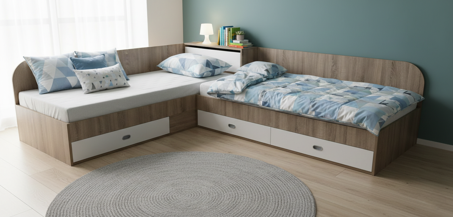 Практично решение за детска или младежка стая, което оптимално използва пространството в ъгъла на помещението. Комплектът включва две единични легла с чекмеджета и ракла. Моделът е изработен от висококачествено ПДЧ с дебелина 18 мм (цвят: дъб сонома и бяло гладко) , което гарантира стабилност и дълготрайност. Подходящи са за еднолицев и двулицев матрак с размер 90/190 см. Може да се монтира с ляво и с дясно разположение.