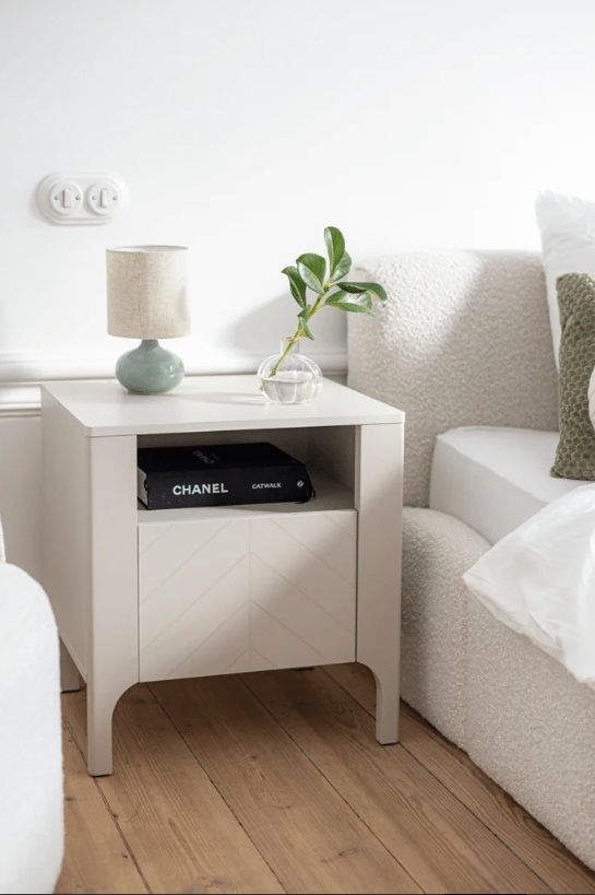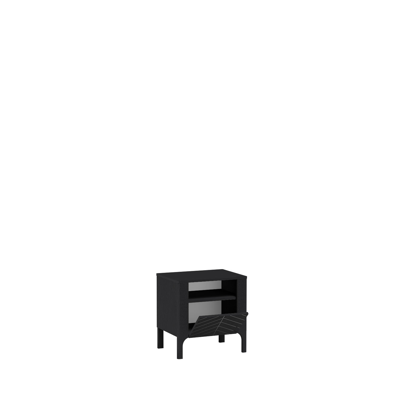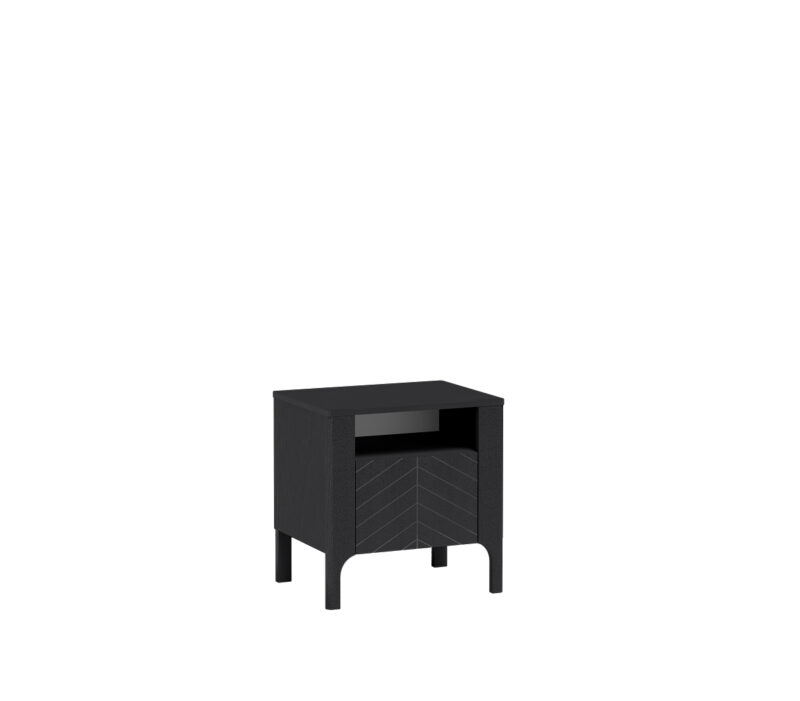 Нощно шкафче с ниша и падаща врата от Колекция Malumi. Изработено от ПДЧ 16мм с 3D принт и крачета от МДФ с височина 15 см, в цветове кашмир и черно. Размер: 54/41/57 см.