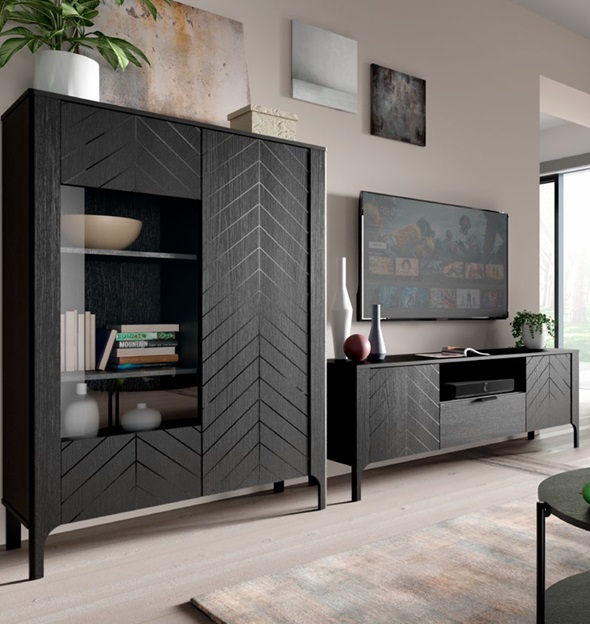 Тв шкаф с две врати, ниша и чекмедже от Колекция Malumi. Изработен от ПДЧ 16мм с 3D принт и крачета от МДФ с височина 15 см, в цветове кашмир и черно. Размер: 160/41/57 см.