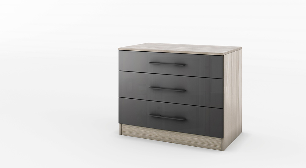 Скрин с три чекмеджета, с плавно затваряне от Колекция Маями, изработена изцяло от МДФ кварц с меламиново покритие и МДФ антрацит гланц. Размер: 90/55/73 см.