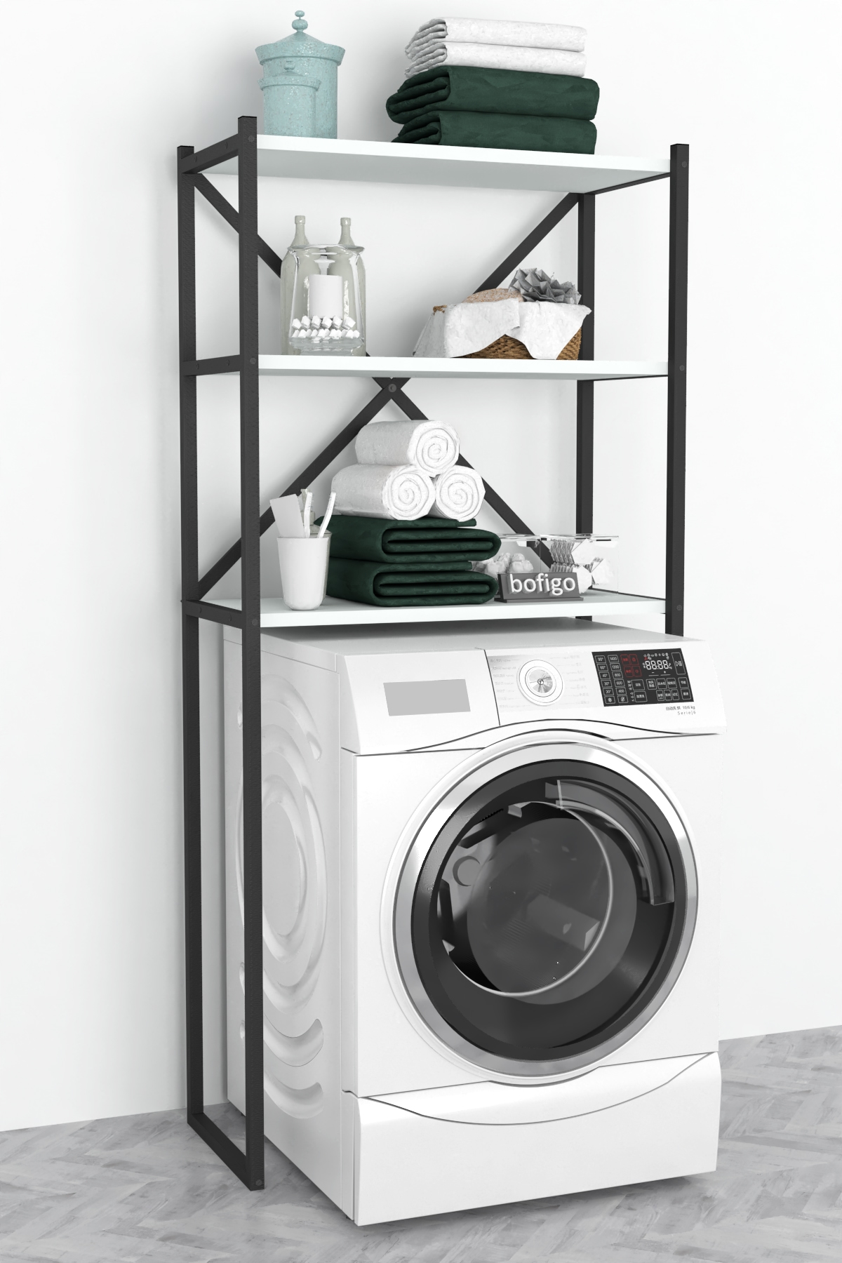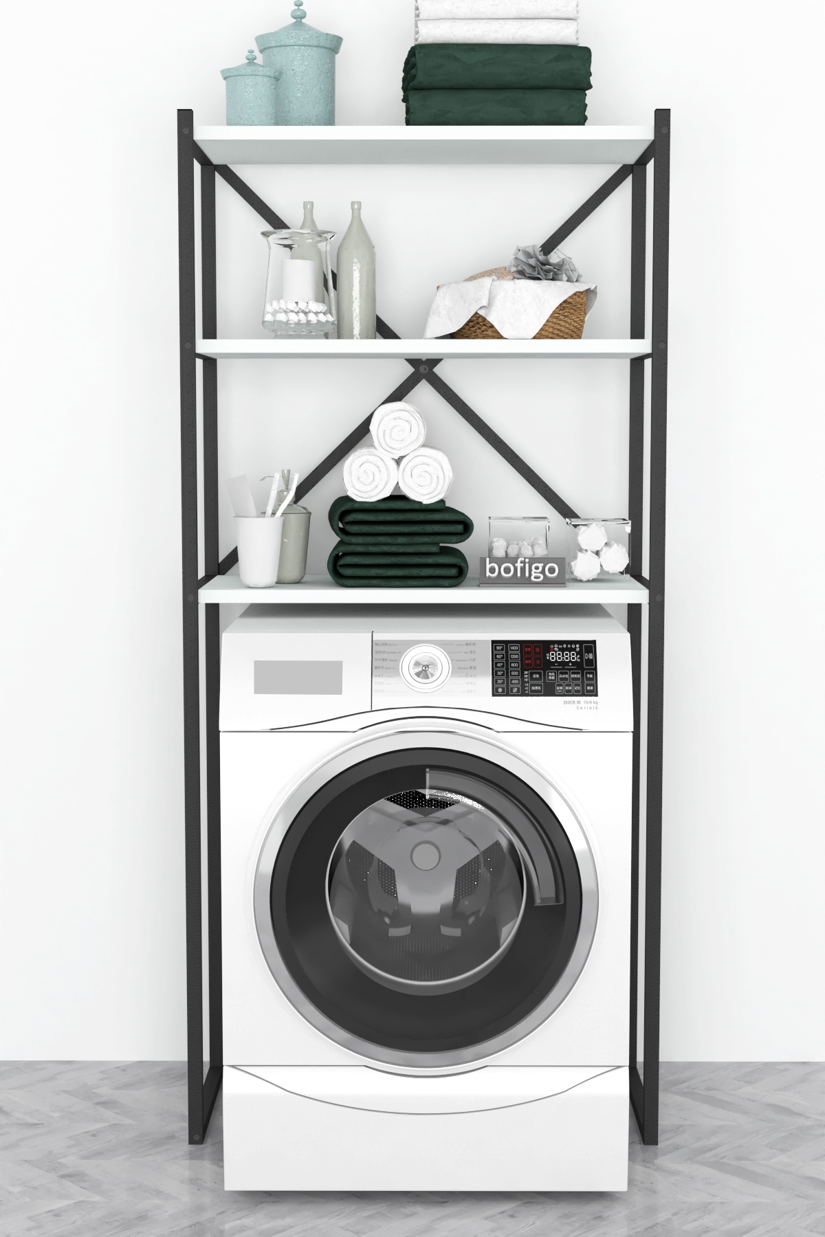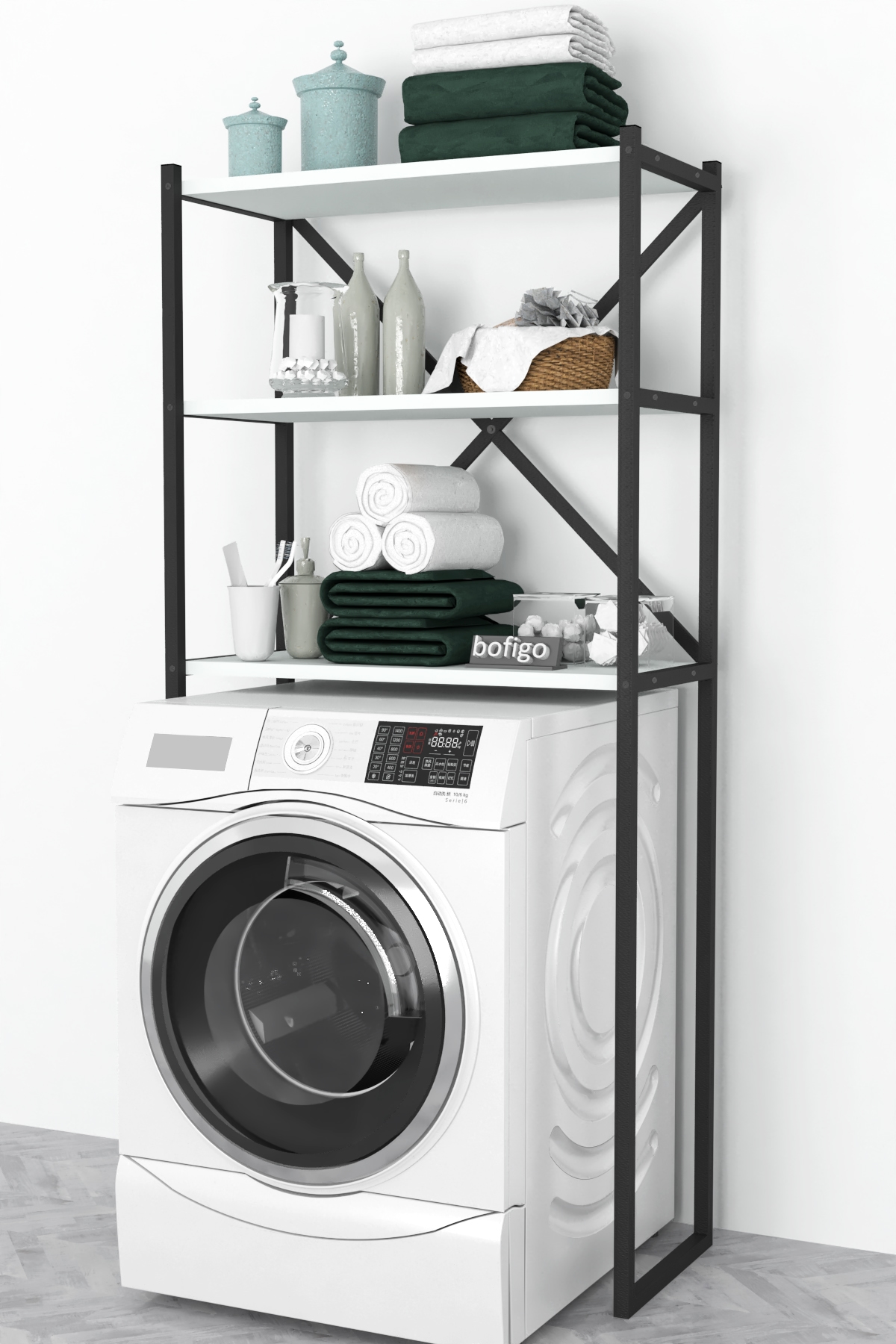 Етажерка с място за пералня и три рафта. Изработена е от метал и ПДЧ. Размер: 66/34/160 см.