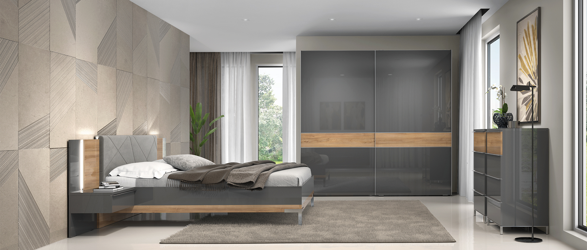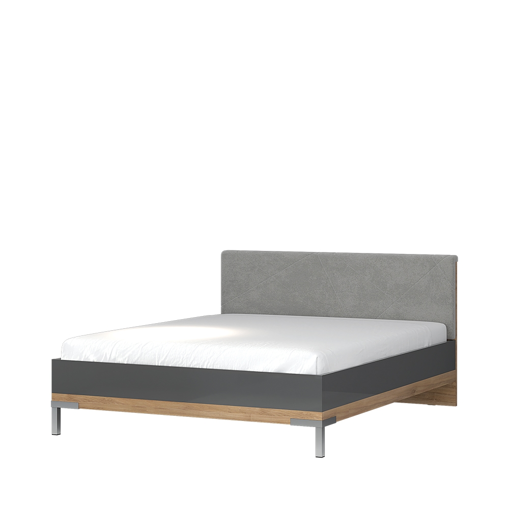 Легло с тапицирана табла от Колекция Оникс. Конструкцията на леглото е покрита с UV лак в цвят антрацит гланц с апликация в дървесен декор орех пасифик. Таблата е тапицирана със сив плюш, който идеално пасва на цвета на конструкцията. Платът позволява по-лесно отстраняване на петна. Дизайнът на леглото е допълнен от два декоративни хромирани крака. Моделът е за матрак с размер 160/200.