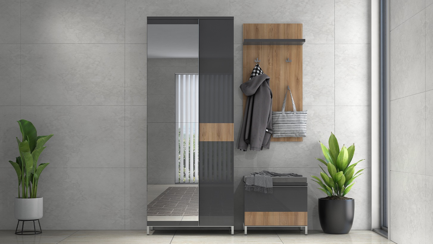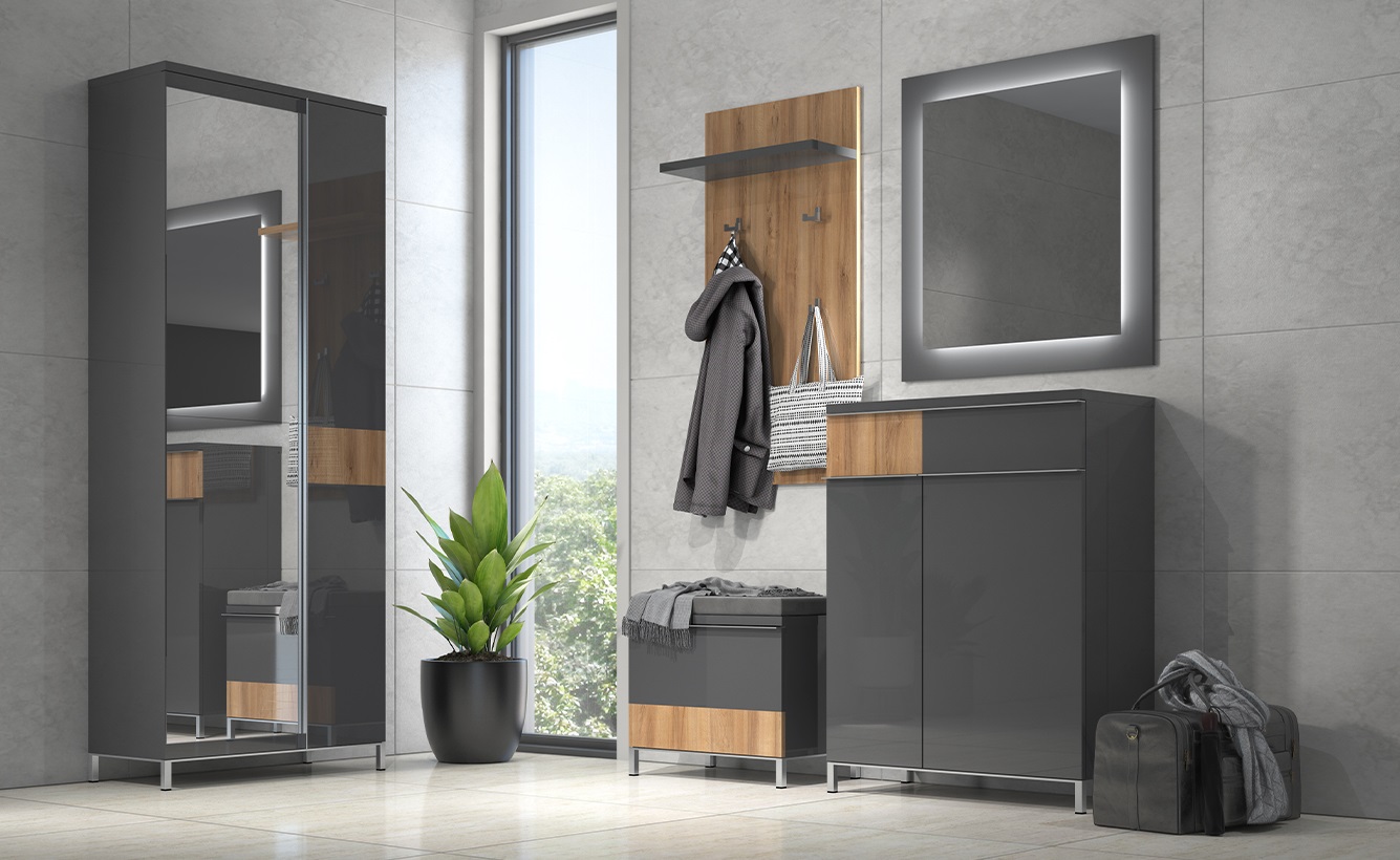 Шкаф за обувки от Колекция Оникс с една врата и тапицирана възглавница за сядане. Всички видими повърхности са покрити с UV лак гланц в атрактивен цвят Антрацит и орех пасифик. Вътрешната част е в текстилен декор. Шкафчето има един вътрешен рафт, газов амортисьор, хромирани дръжки и елегантни хромирани крачета. Възглавницата е тапицирана с висококачествена водоустойчива материя, която е лесна за поддръжка.
