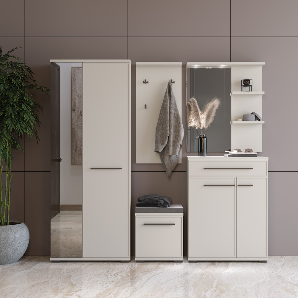 Гардероб за антре с една плътна врата и една с огледало от колекция Опера. Корпус и лицева част (декоративна профилирана MDF рамка) лакирани с мек матов UV лак в цвят Кашмир. Вътрешната част е в цвят текстил. Механизмите за плавно затваряне осигуряват допълнителен комфорт при ежедневна употреба. Размер: 76/36/194 см.