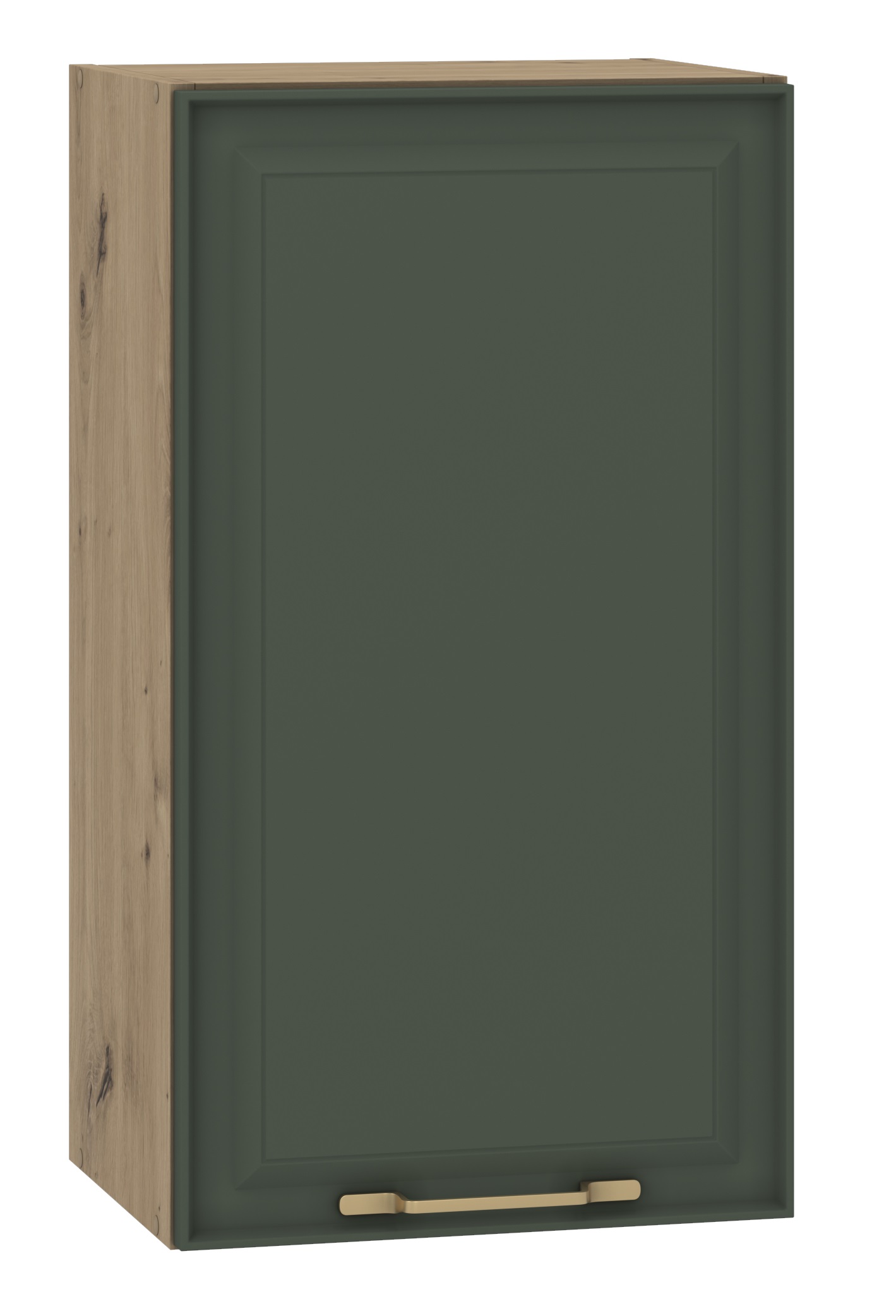 Горен кухненски шкаф с една врата и един рафт, изработен от ПДЧ с дебелина 16мм цвят дъб артисан и МДФ 19мм в цвят тъмно зелено Soft, панти с плавно прибиране и метална дръжка в цвят злато. Отваряне на вратата – универсално.