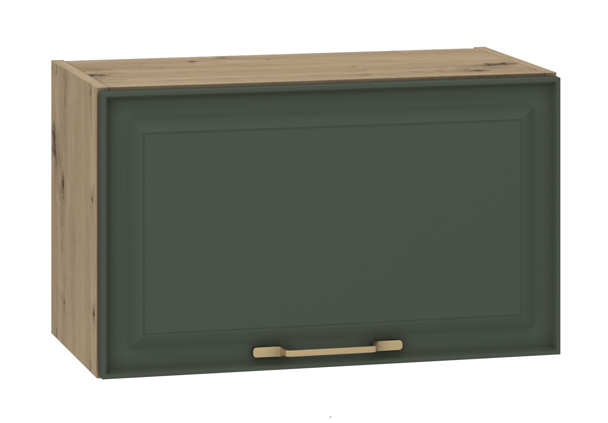 Горен кухненски шкаф с една врата, изработен от ПДЧ с дебелина 16мм цвят дъб артисан и МДФ 19мм в цвят тъмно зелено Soft, панти с плавно прибиране и метална дръжка в цвят злато. Отваряне на вратата - хоризонтално.