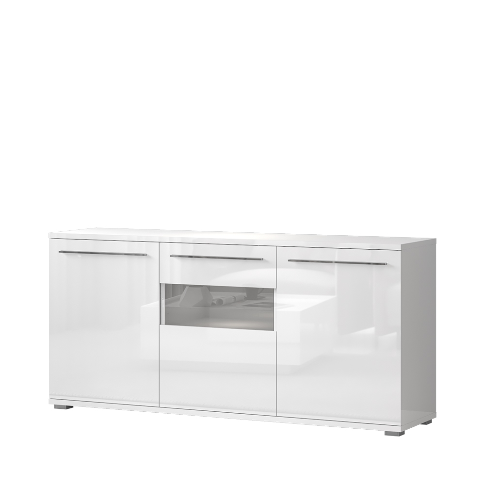 Функционален комод за дневна с две плътни врати и една витрина от Колекция Пиано. Всички видими повърхности са покрити с UV лак в топъл бежов цвят или кристално бяло. Механизмите за плавно затваряне са по-устойчиви на износване, осигуряват максимална издръжливост и допълнителен комфорт при ежедневна употреба.