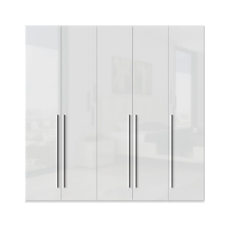 Функционален гардероб с пет врати от колекция Пиано. Всички видими повърхности са покрити с гланц UV лак, четири пъти по-устойчив на физически повреди в сравнение със стандартното лакиране. Вътрешната част е в бял цвят. Механизъм за плавно затваряне осигурява допълнителен комфорт при ежедневна употреба.