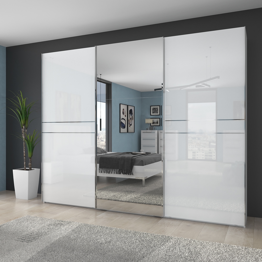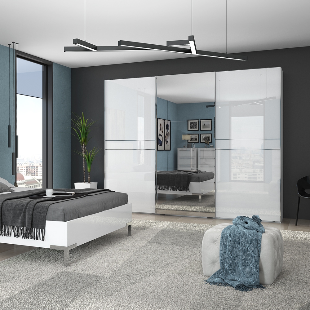 Функционален гардероб с три плъзгащи врати и огледало от колекция Пиано. Всички видими повърхности са покрити с гланц UV лак, четири пъти по-устойчив на физически повреди в сравнение със стандартното лакиране. Вътрешната част е в бял цвят. Механизмите за плавно затваряне осигуряват допълнителен комфорт при ежедневна употреба.