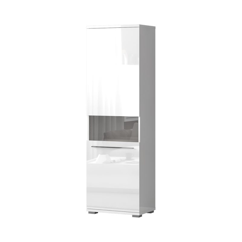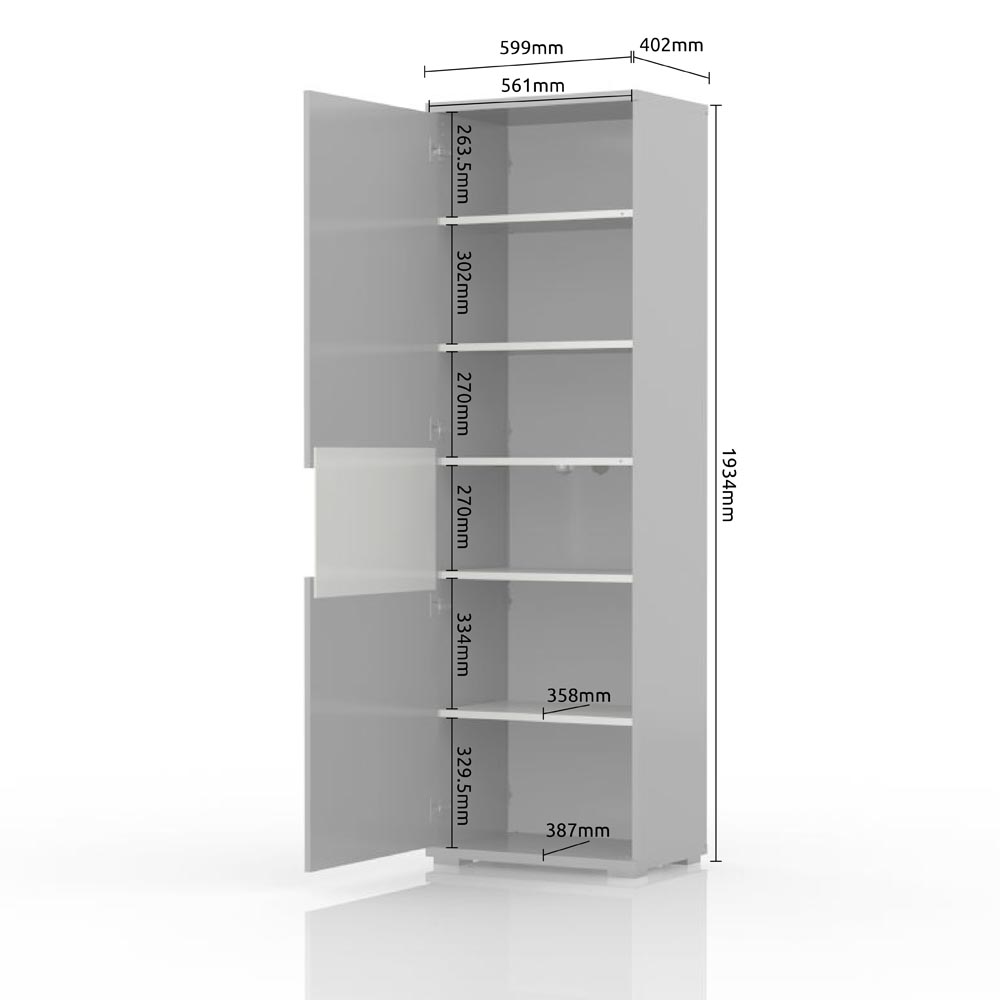 Функционална витрина за дневна от Колекция Пиано с една стъклена врата. Всички видими повърхности са покрити с UV лак в топъл бежов цвят или кристално бяло. Механизмите за плавно затваряне са по-устойчиви на износване, осигуряват максимална издръжливост и допълнителен комфорт при ежедневна употреба. С възможност за промяна на позицията на вратите. Закалено стъкло и LED осветление допринасят за приятна атмосфера на стаята.