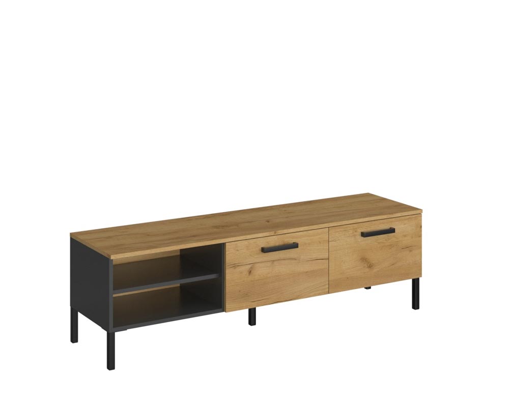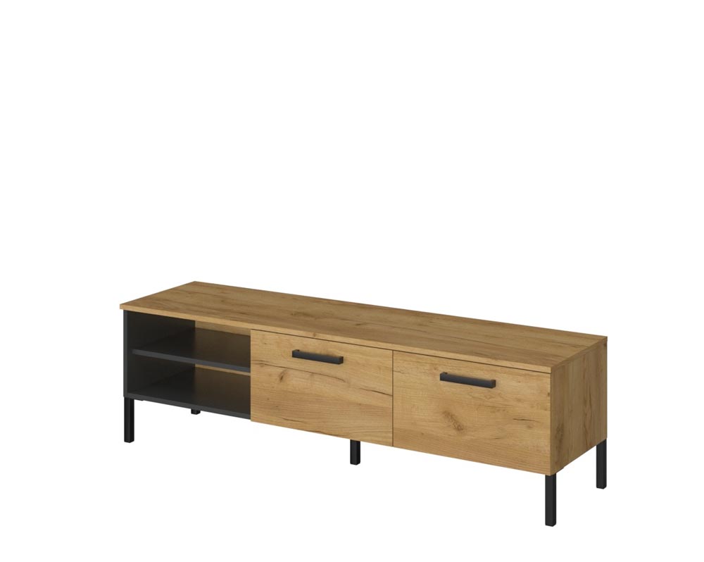 Тв шкаф с две падащи врати и две ниши от Колекция Сантес. Изработен от ПДЧ в актуални цветове златен дъб крафт и антрацит и черни метални крачета. Размер: 155/42/45,7.