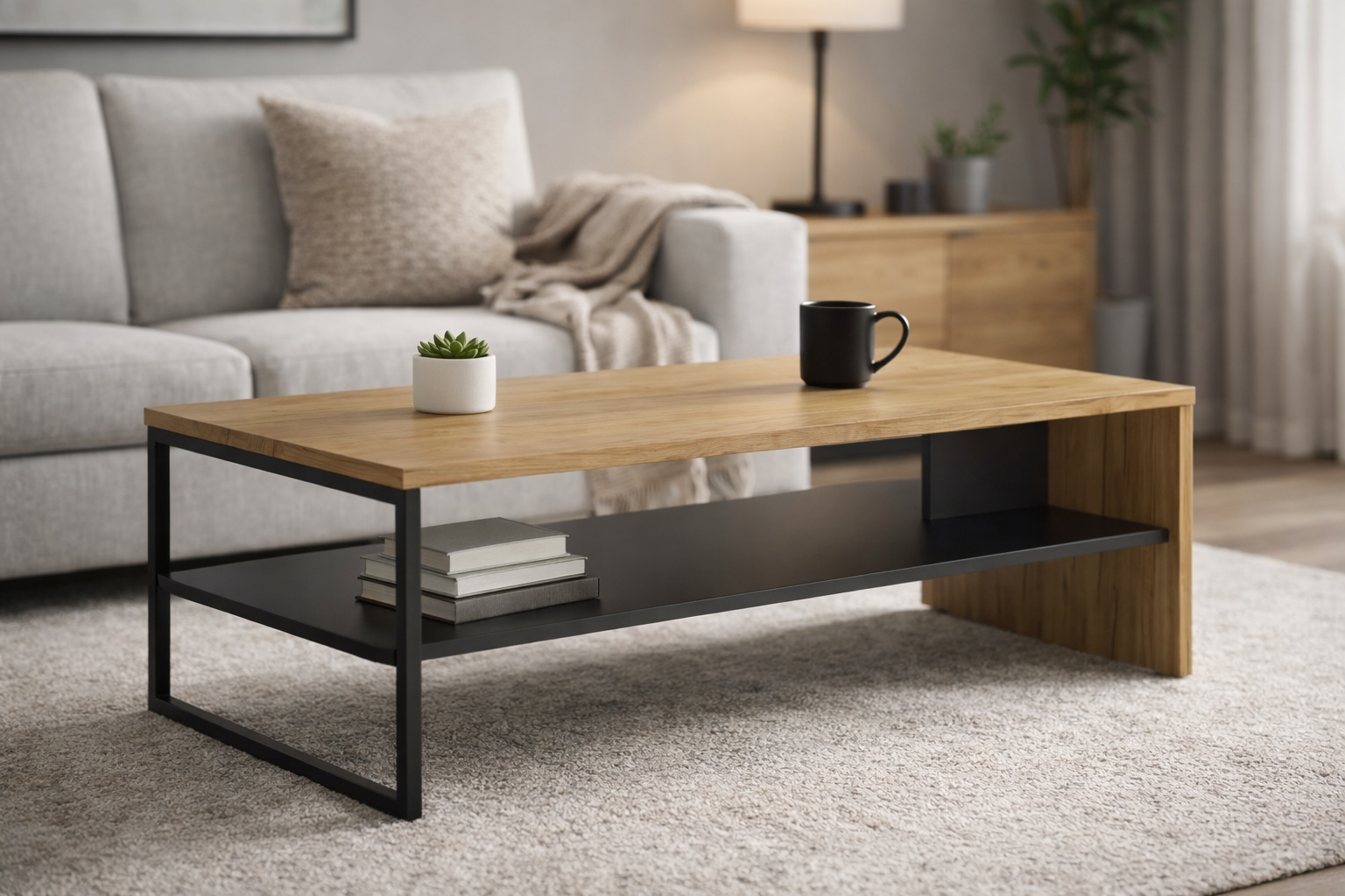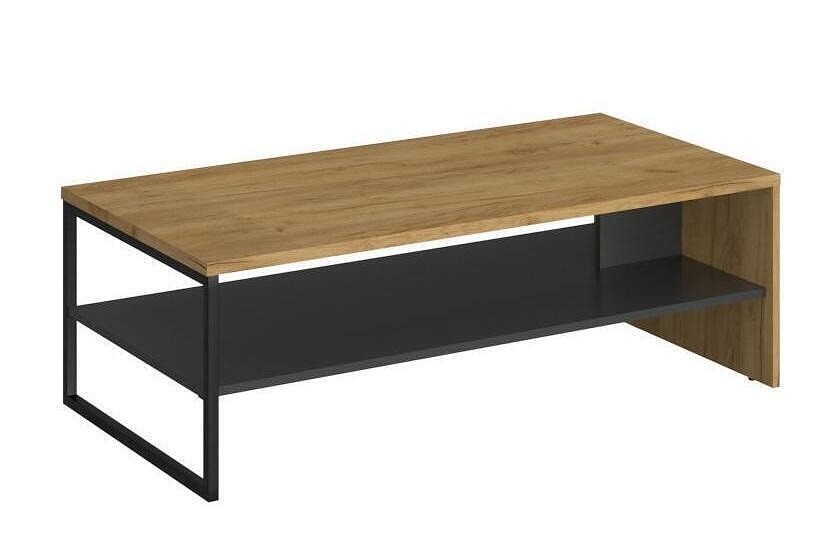 Функционална холна маса с два плота, изработена от ПДЧ. Масата е в комбинация от два цвята - златен дъб крафт и антрацит. Черен метален крак от едната страна завършва страхотната визия.
