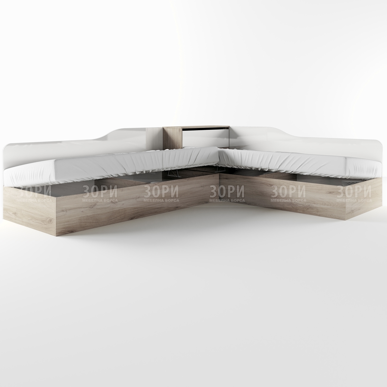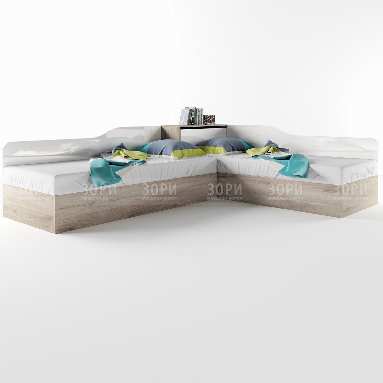 Комплект ъглови легла Сити 2043 представлява две свързани ъглови легла с табла. Те разполагат с повдигащ механизъм за еднолицев матрак 90/200 см. Изработени от ПДЧ с дебелина 16 мм. Размер: 223,5/293/81 см.