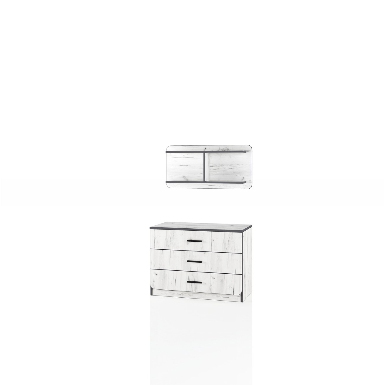 Скрин с три чекмеджета с ролкови водачи и етажерка за окачване на стена. Изработен от ПДЧ с дебелина 16 мм в цвят дъб крафт бял.